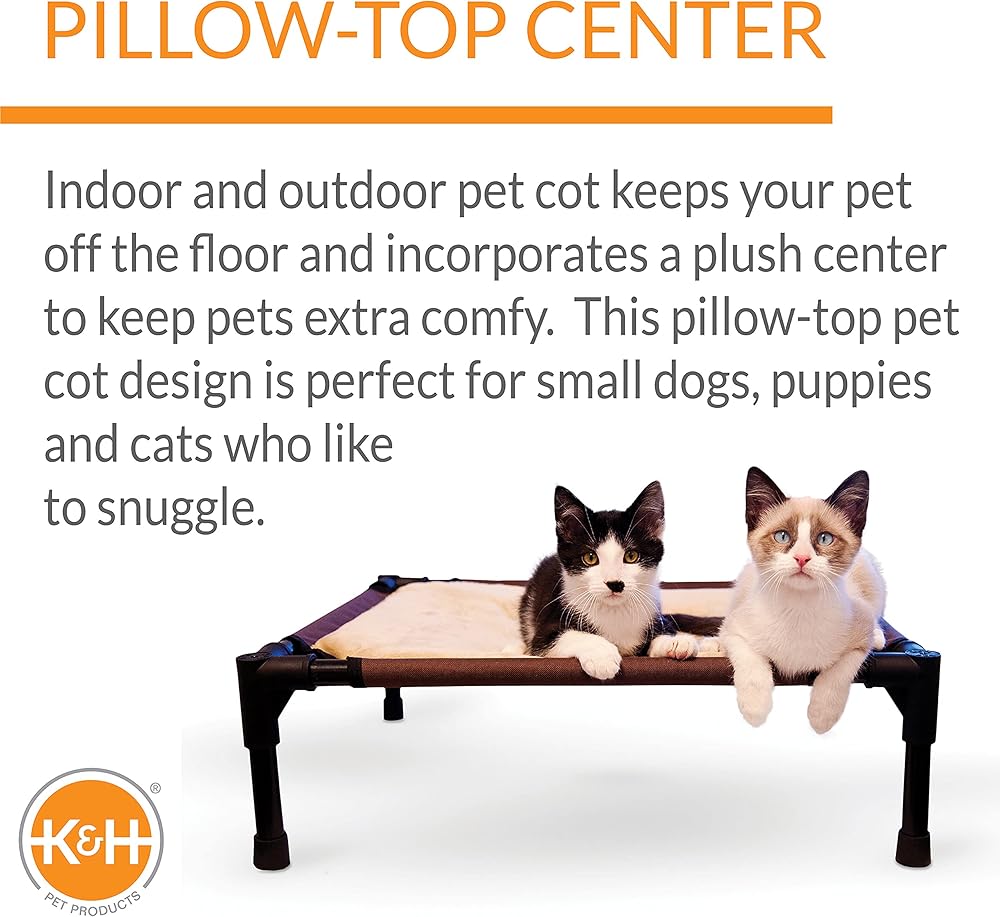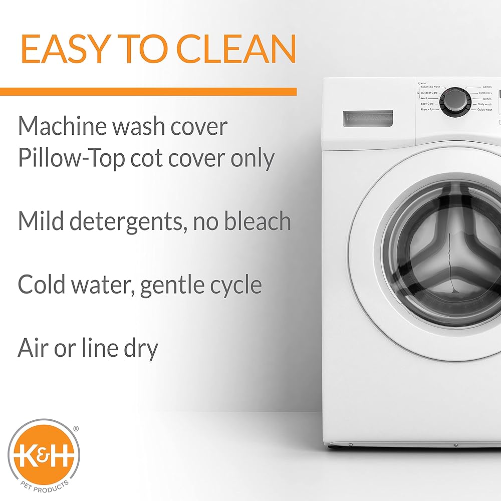 The K&H Comfy Pet Cot keeps your dog elevated off the ground and incorporates a plush center to keep dogs extra comfy. The easy to assemble raised dog bed requires no tools! Can be disassembled and taken anywhere. Raised dog bed is great for camping, hiking, picnics or anywhere at home inside or out. Made with water resistant, heavy denier fabric and a plush center for comfort. Cover is removable and washable. Slip resistant rubber feet help protect floor surfaces. The K&H Pet Cot is durable and can hold up to 200 pounds. Indoor or outside use. Available in multiple sizes. The K&H Pet Cot line features an Original Pet Cot, Original Bolster Pet Cot, Self-Warming pet Cot, Coolin' Pet Cot, and a small Comfy Pet Cot,. Replacement covers are for available separately and can easily be interchanged to suit your pets needs for each season. An optional K&H Pet Cot Canopy is available to hook onto any K&H Pet Cot to offer additional shade and cooling power for your pets.