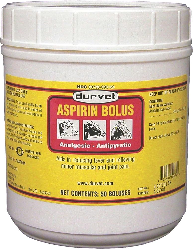 Aspirin bolus. To be used oral fl as an aid in reducing fever and in relief of minor muscular aches and joint pains in cattle and horses. For use on cattle and horses. Powerful 240 grain Boluses give the animal quick relief. Relaxes smooth muscles of the blood vessels relieving pain. Salicylates will not affect the heart of the animal.