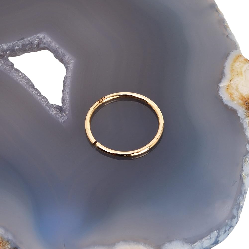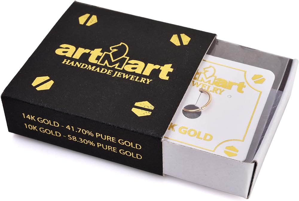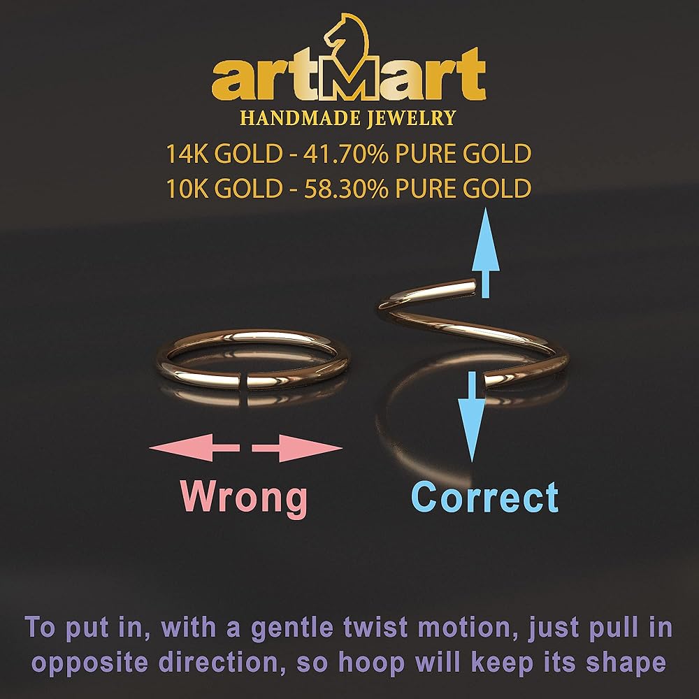 Each ring is handmade from start to finish. Raw 24K solid gold is melted by hand to craft 14K solid gold. The gold is then shaped into wire with a final thickness based on your gauge selection. Every purchase is strictly handmade to order, and no two are exactly alike. The wire is shaped, soldered, sized, and polished all by hand. This is a professional handmade nose ring and not manufactured in a factory. ARTMART guarantees that this piece is made of SOLID GOLD and stamped in accordance with internationally recognized jewelry standards.