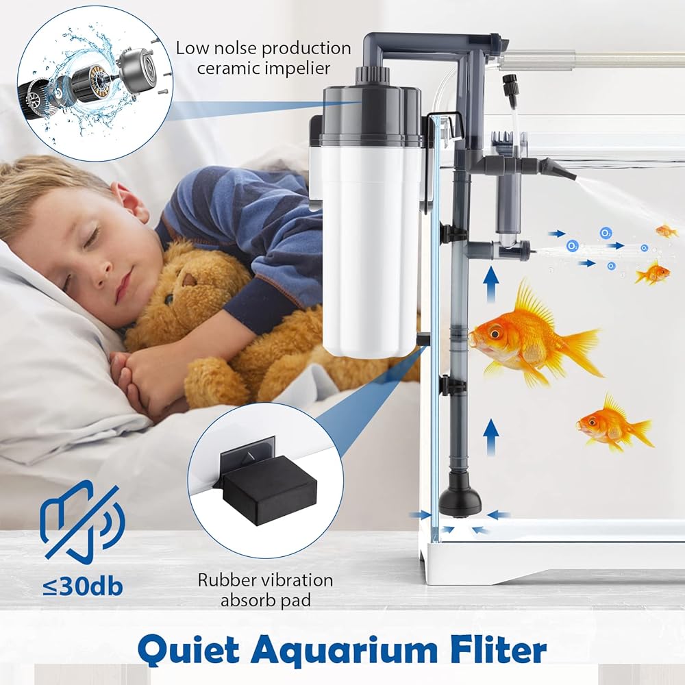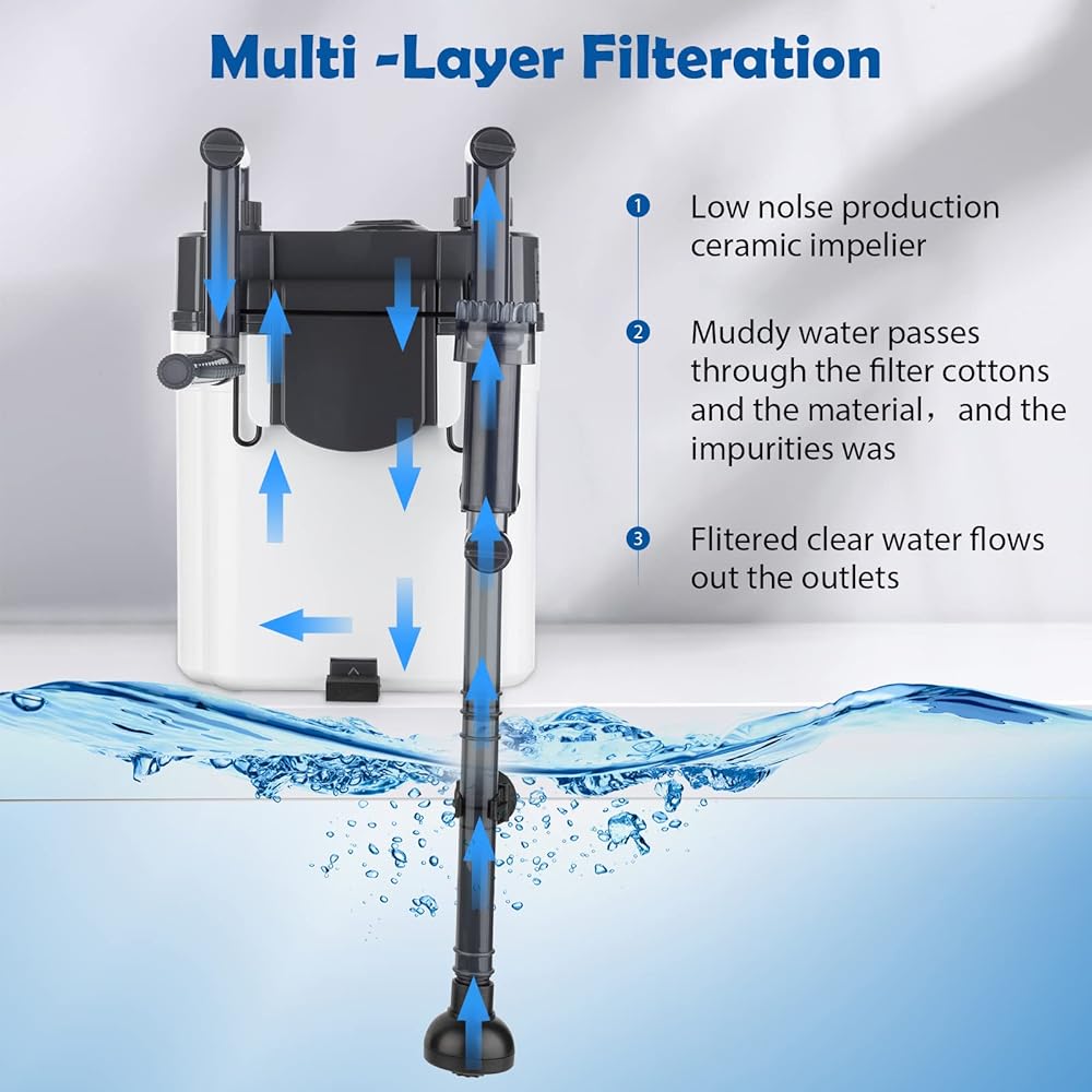 With built-in motor in the lid of the canister filter, the filter runs ultra quietly. The sound is ≤ 30db, your family life will not be affected, at the same time achieving wate