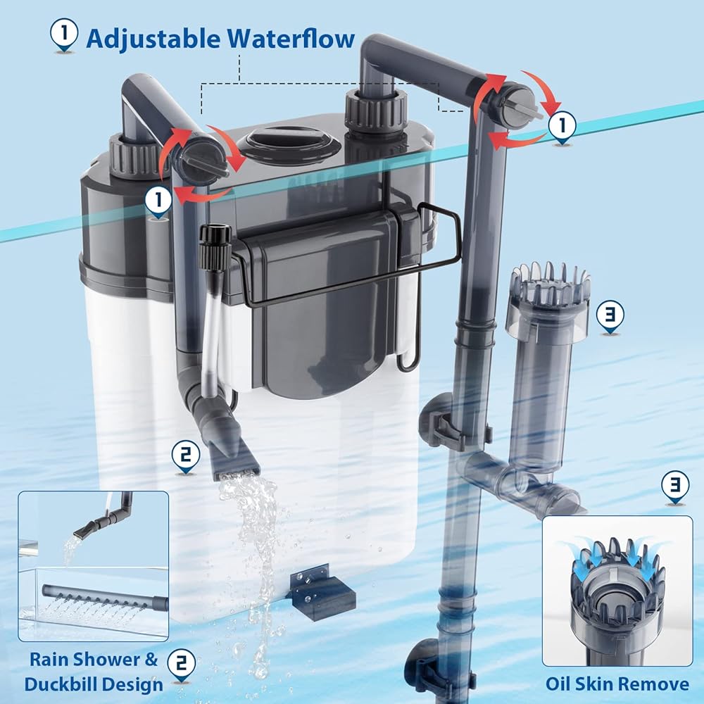 The water flow can also be adjusted by rotating the flow control knob on the pipes.with the Rain Shower & Duckbill Design and the surface skimmer to remove the skim truly multifunctional in one