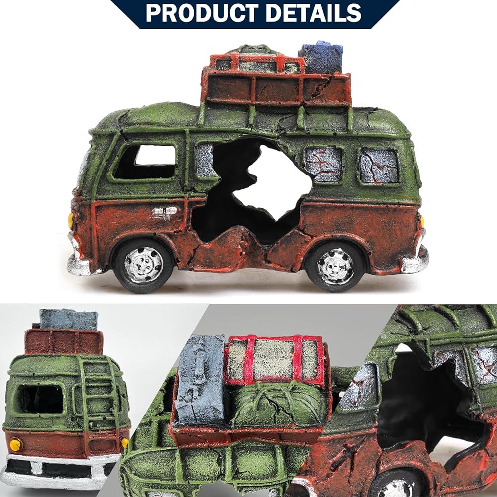 قم بتزيين حوض السمك الخاص بك: أضف بعض السحر الغريب والعجائب إلى حوض السمك الخاص بك مع ديكور حوض السمك الصغير لحطام السيارة. تتميز هذه الزينة المائية الملونة بالكامل بحطام سيارة، بجسم أخضر وبرتقالي، وجسم تالف واقعي، وتفاصيل عجلة تعطي إحساسًا واقعيًا، قم بتغيير حوض السمك وخزان الزواحف الخاص بك إلى مشهد جميل.