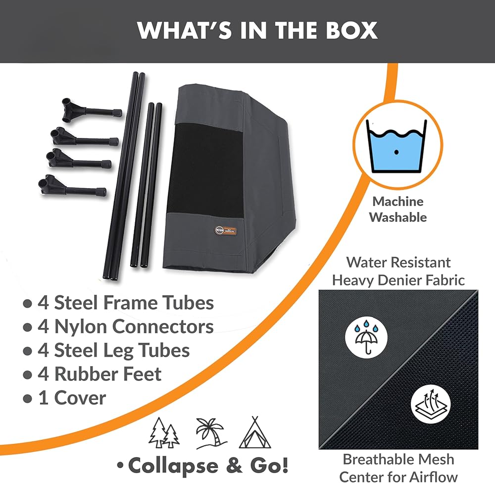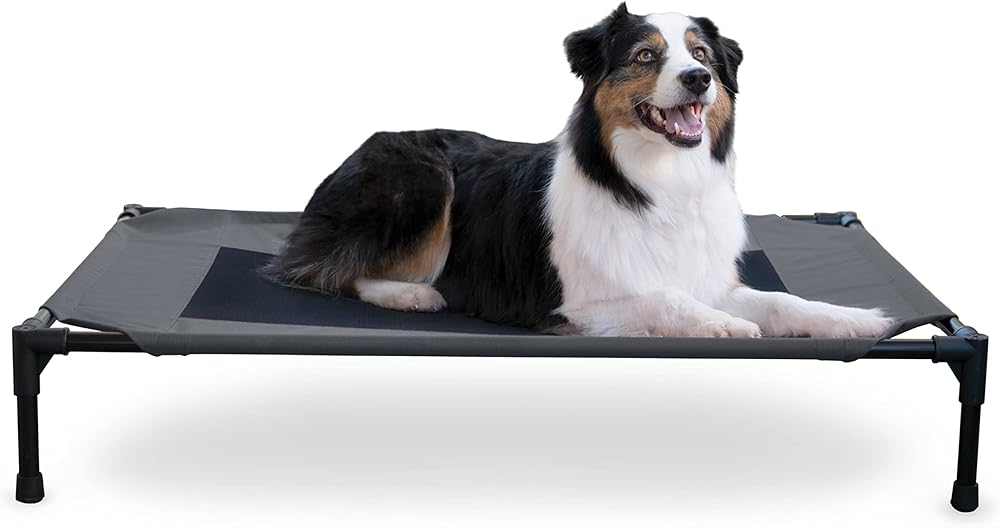 The K&H Pet Products Pet Cot raised dog bed keeps your dog elevated and off the ground allowing air to flow around your pet to keep them cool. The easy to assemble elevated pet bed requires no tools! Can be disassembled and taken anywhere. Our raised dog bed is great for camping, hiking, picnics, or anywhere at home inside or out. Made with water-resistant, heavy denier fabric and a breathable mesh center that repels moisture. The cover is removable and washable or can be hosed off outdoors. Slip-resistant rubber feet help protect floor surfaces. The K&H Pet Cot is durable and can hold up to 200 pounds; the X-Large & Jumbo sizes can hold up to 300 pounds. Indoor or outside use. Available in multiple sizes and colors for any size dog and cats too: Small dogs/cats 17" x 22", Medium dogs 25" x 32", Large dogs 30" x 42", and Extra-Large dogs 32" x 50". Jumbo XXL dogs 56" X 38".