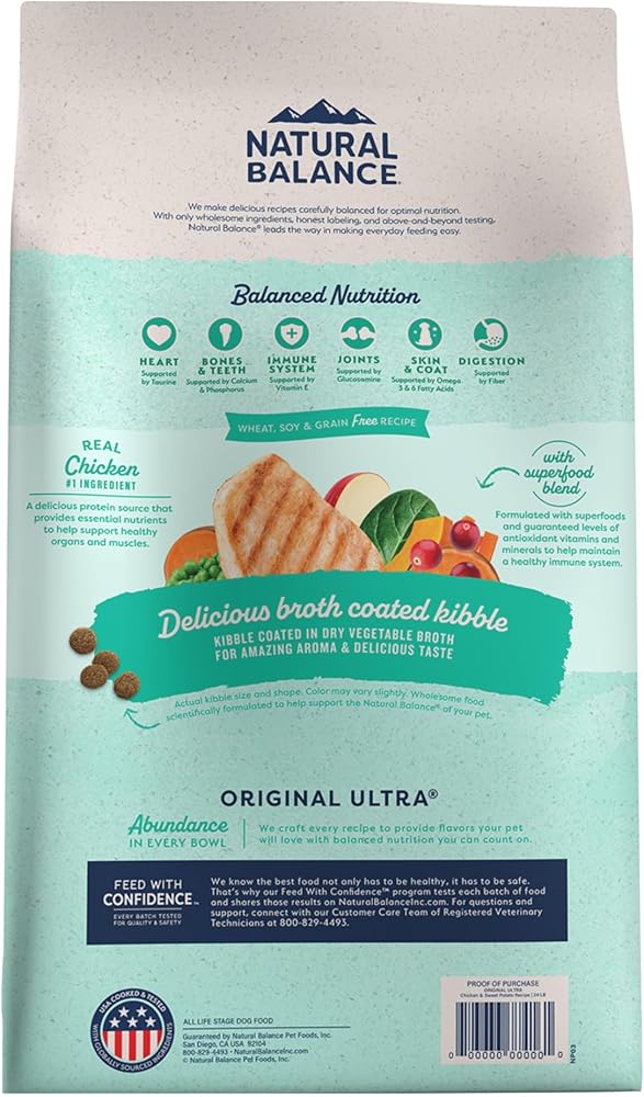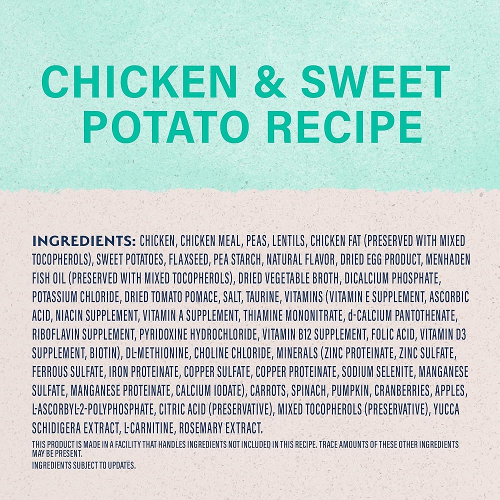 Fill your dog's bowl with an abundance of tasty nutrition! Our kibble is coated in dry vegetable broth for amazing aroma and delicious taste with real chicken as the first ingredient. Chicken is a quality protein source that provides essential nutrients to help support healthy organs and muscles. Formulated with a Superfood Blend that includes peas, sweet potatoes, carrots, spinach, pumpkin, cranberries, and apple and guaranteed levels of antioxidant vitamins and minerals to help maintain a healthy immune system. Wheat, soy, and grain FREE recipe.