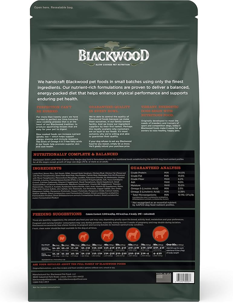 Blackwood Pet is proud to offer made in the USA, dry dog food for all life stages from puppy to senior. We want the best for your dog, so we handcraft our dry dog food in small batches with only the finest natural ingredients. Our recipes are formulated without corn, wheat, or soy to give your dog wholesome goodness without artificial flavors and fillers. At the heart of Blackwood's success is our time-honored commitment to slow cooking. Perfected over the course of more than twenty years, we continue to create super premium, wet and dry dog food recipes that taste great and are easy to digest. Slow cooked foods also increase nutrient intake which may improve energy, stamina, and immune response. The levels of omega 3 and omega 6 fatty acids in our dog food help promote superior skin and coat. We believe in tradition and are committed to taking the time to handcraft our protein rich dog food recipes with whole grains, vegetables, and fruit for a wholesome goodness your dog will love. Since we make our dry dog food in small batches at our family-operated facility in Ohio, we control and the quality. We are pet parents, too and believe in 100% happiness. If you are not happy, please reach out to us @Info@blackwoodpetfood, and we will make it right.
