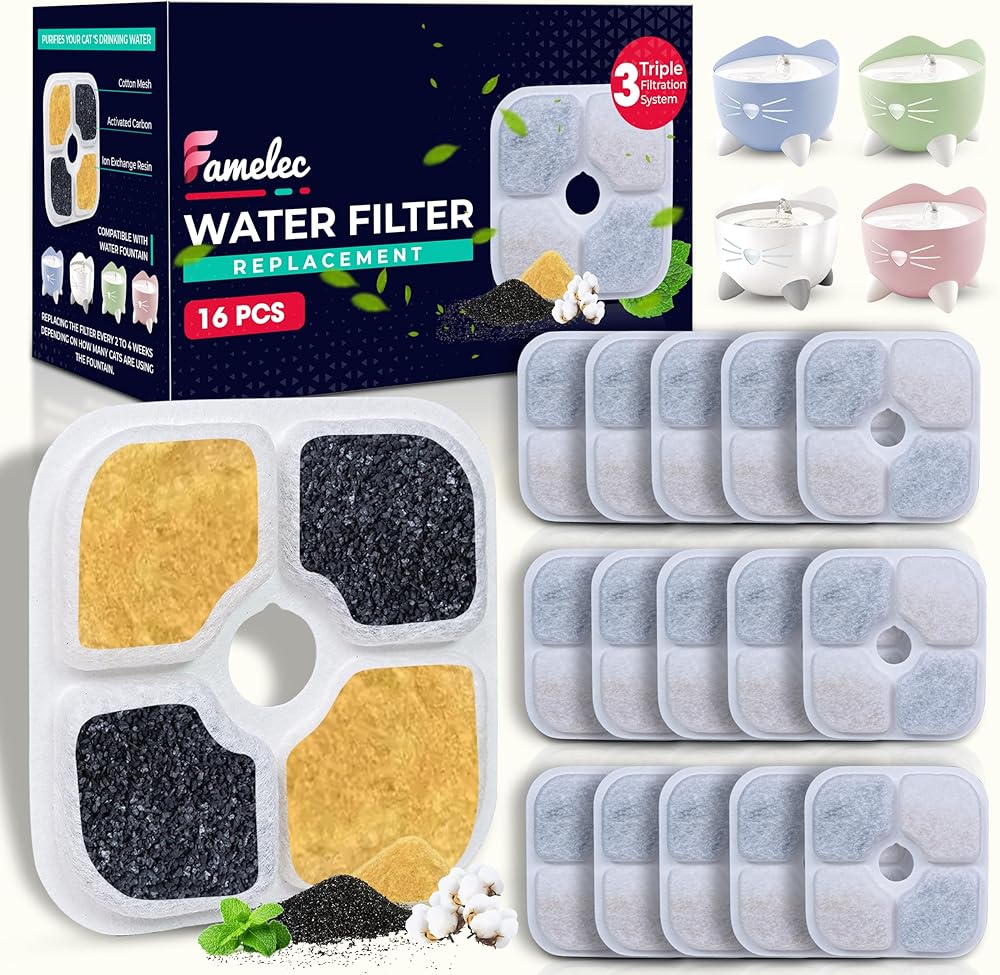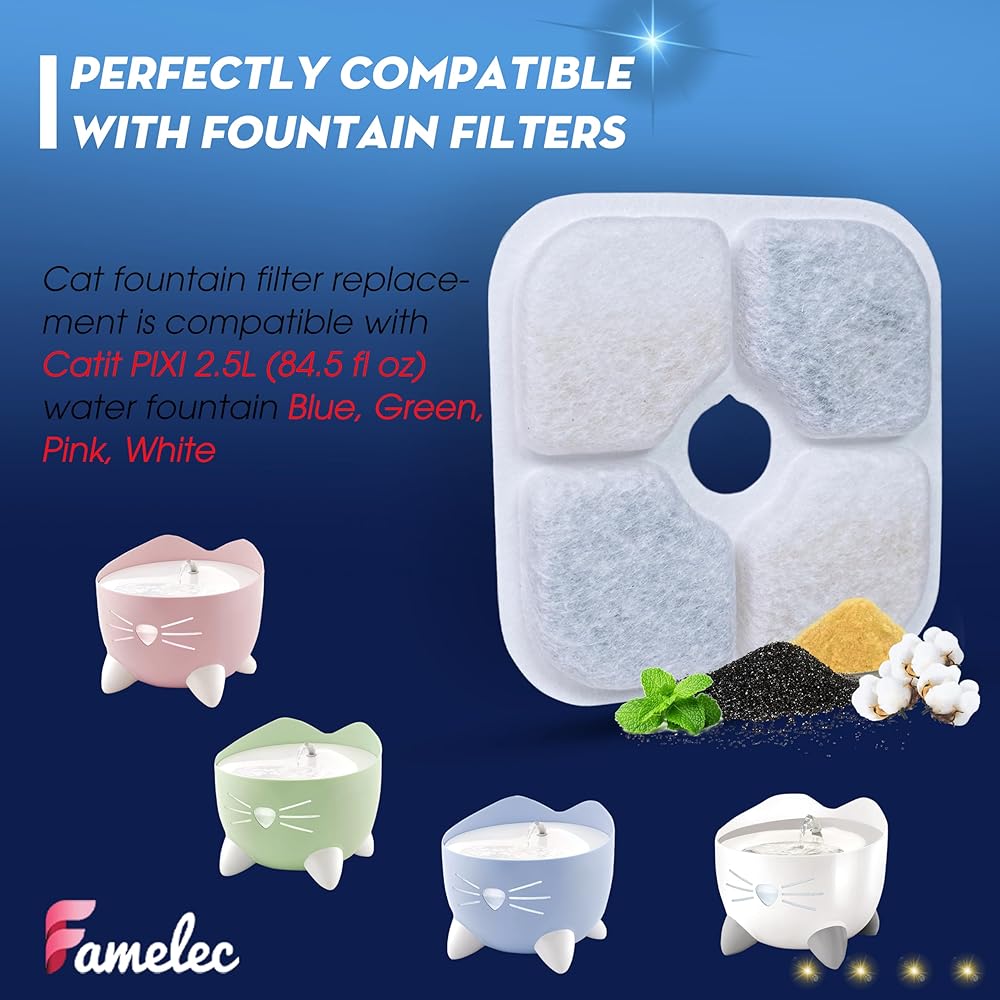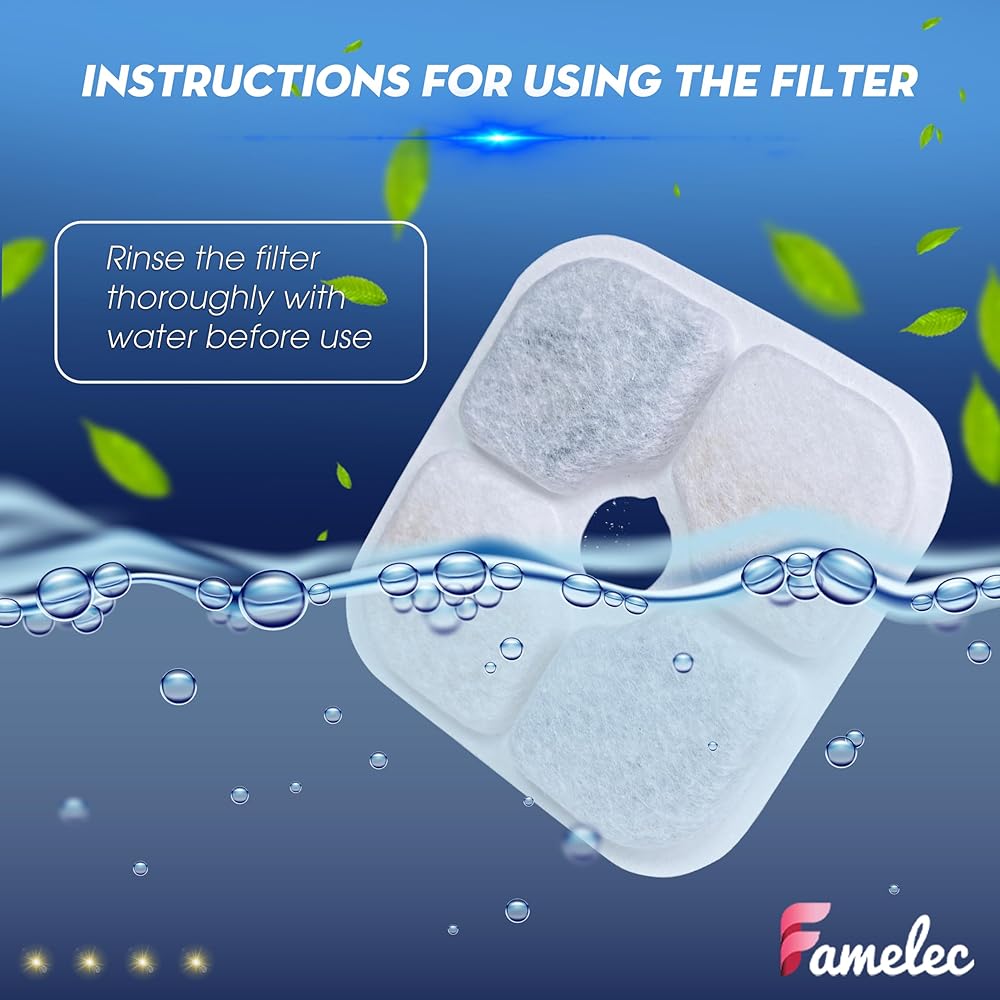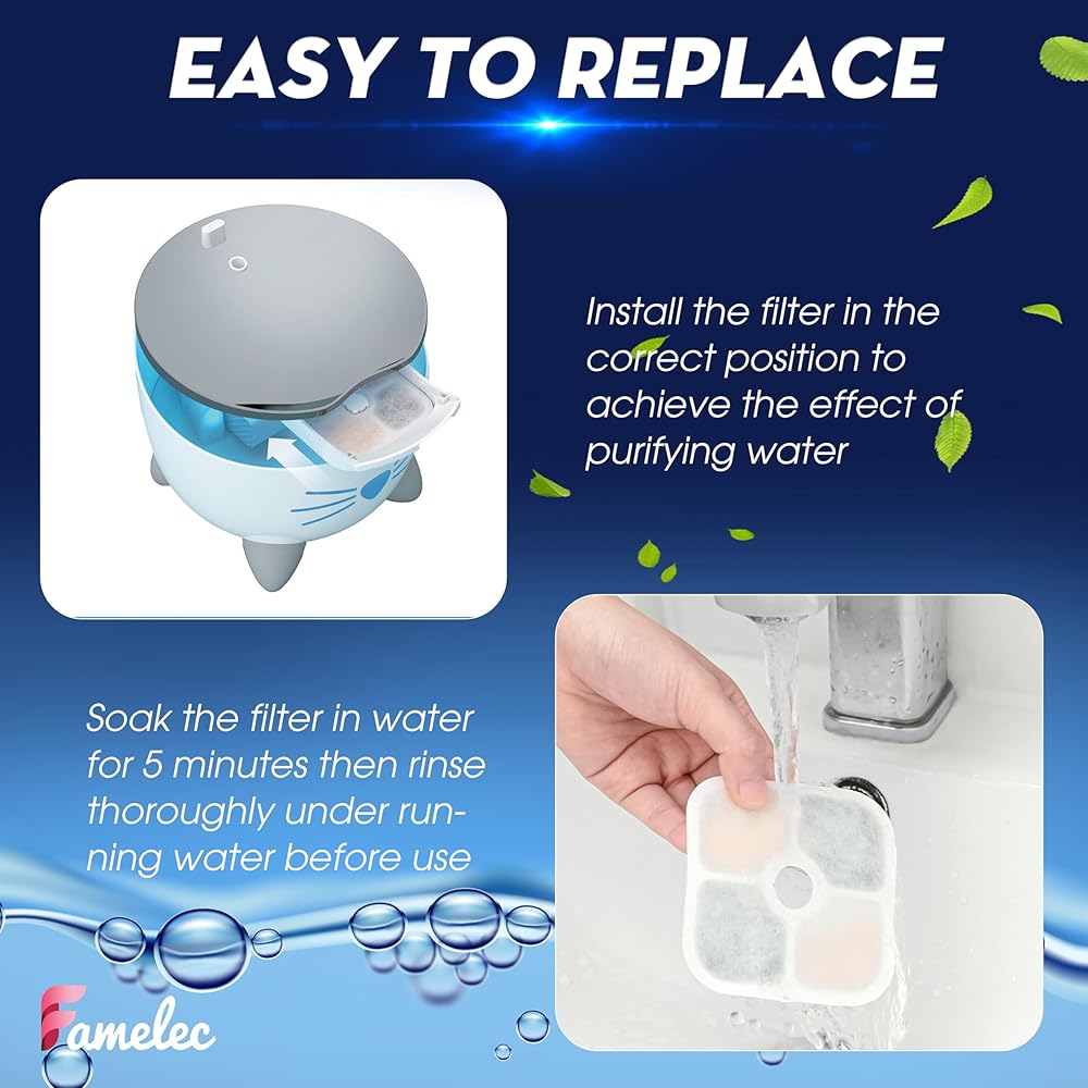 💦 التنظيف والاستبدال: لمنع تساقط غبار الكربون المنشط في الماء، يرجى نقع بديل فلتر نافورة المياه Pixi Catit في الماء لمدة 5 دقائق ثم شطفه بالكامل تحت الماء الجاري قبل الاستخدام. بفضل عملية التثبيت السهلة، يمكنك بسهولة استبدال المرشحات القديمة والحفاظ على إمدادات ثابتة من المياه العذبة والنظيفة لقطتك دون أي متاعب. نوصي باستبدال الفلتر كل 2 إلى 4 أسابيع، اعتمادًا على عدد القطط التي تستخدم النافورة.
