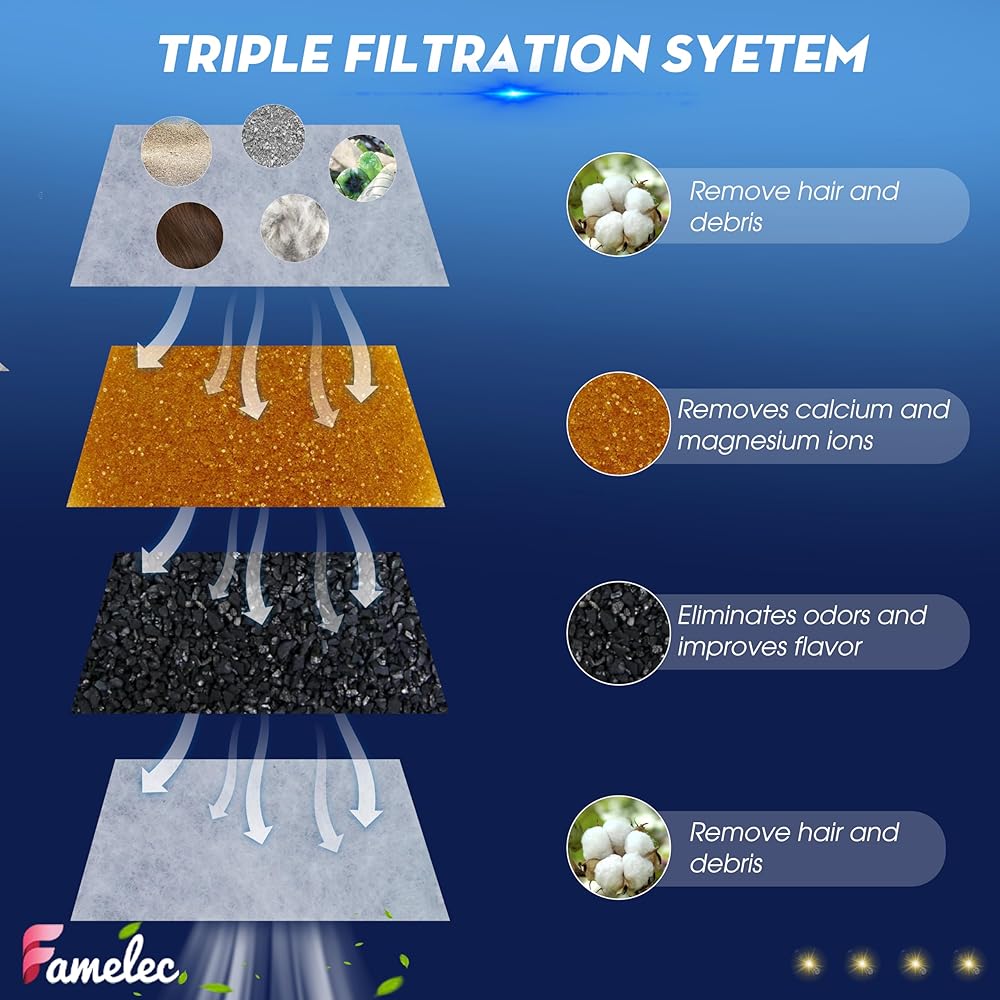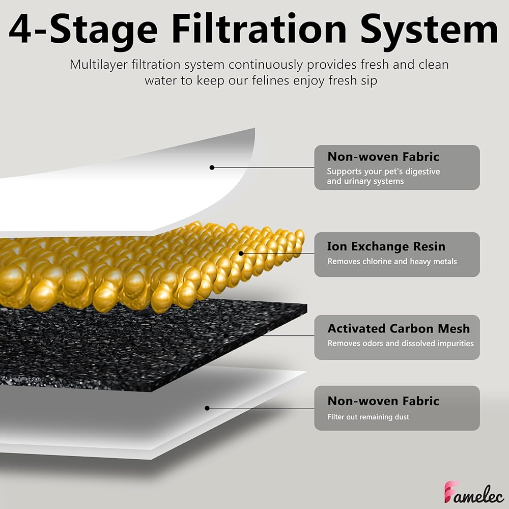 💦 نظام ترشيح ثلاثي: يعمل فلتر نافورة مياه القطط على تنقية مياه حيوانك الأليف بثلاث طرق، حيث يزيل الكربون النشط الروائح والشوائب، ويعمل راتنج التبادل الأيوني على تنعيم مياه الصنبور عن طريق تصفية الكالسيوم والمغنيسيوم الزائد، وتزيل الشبكة القطنية الموجودة في الطبقة الخارجية للفلتر الشعر. والرواسب والحطام. تأكد من حصول كلابك وقططك على المياه النظيفة لنافورة بيكسي للحيوانات الأليفة.