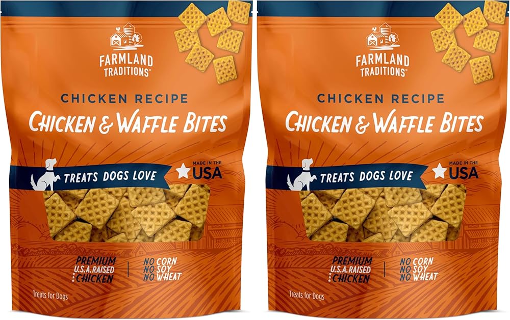 Our Farmland Traditons Waffle Bites are made in our USA facility with USA chicken. These bite size waffle treats are made with no corn, soy, or wheat and are simply air dried to create the savory taste that dogs love!