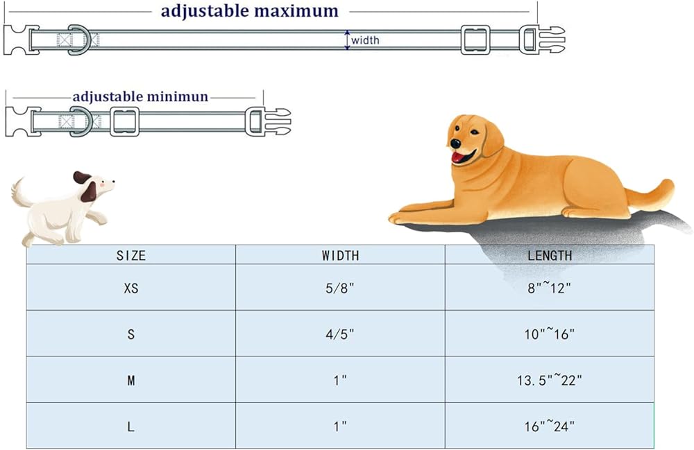 • SIZE: XS Collar (Width : 5/8"Length : 8-12"). S Collar (Width : 4/5" Length : 10-16"). M Collar (Width : 1" Length : 12-22"). L Collar (Width : 1" Length : 16-24").