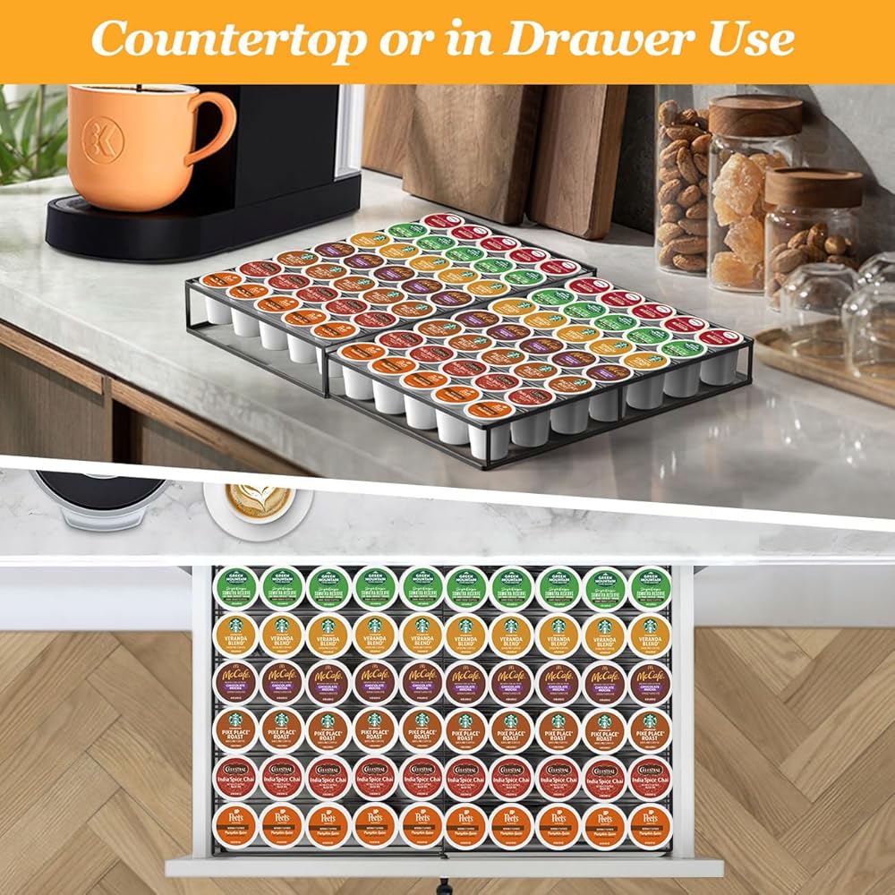 درج حامل كبسولات القهوة، حامل أكواب K قابل للتوسيع متوافق مع Keurig K-Cup، منظم درج الأكواب K يحمل 35-70 تخزين كبسولات القهوة لمكتب محطة القهوة والمطبخ، أسود