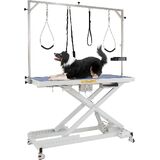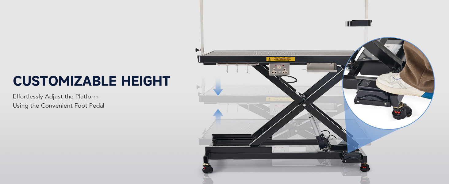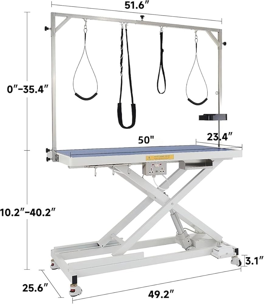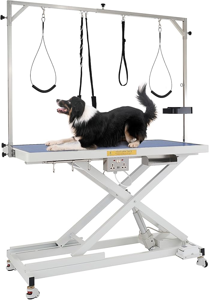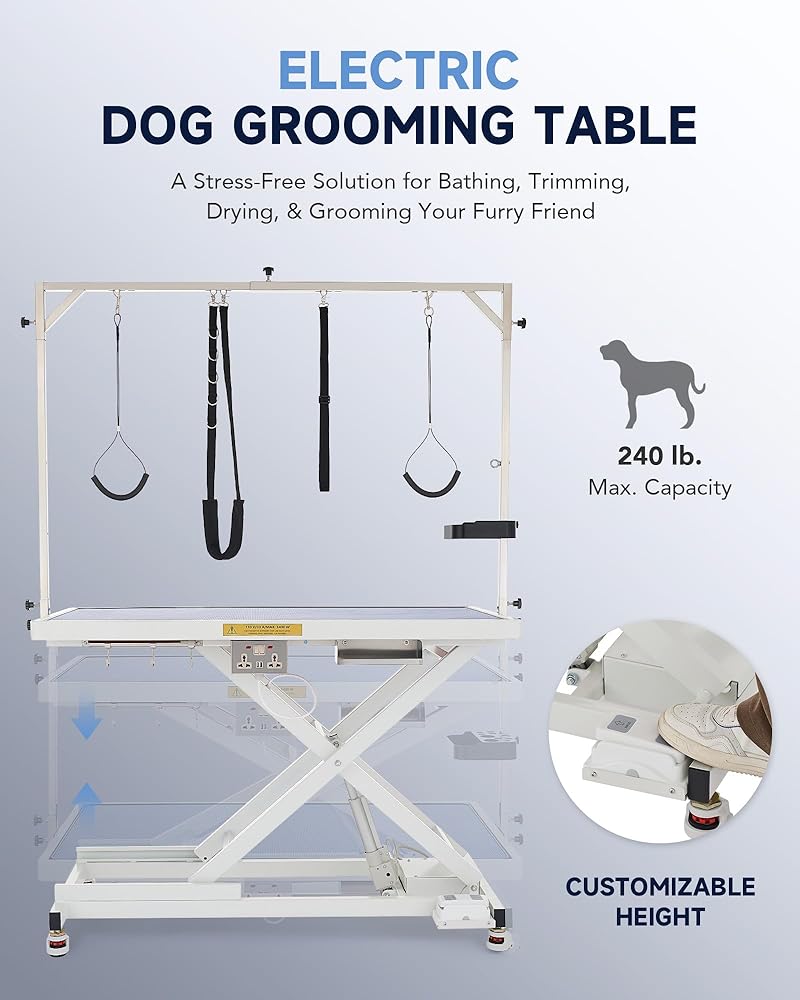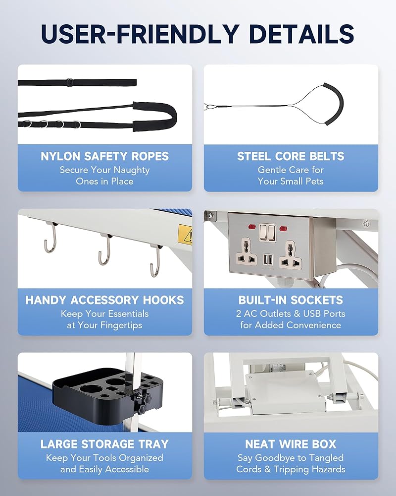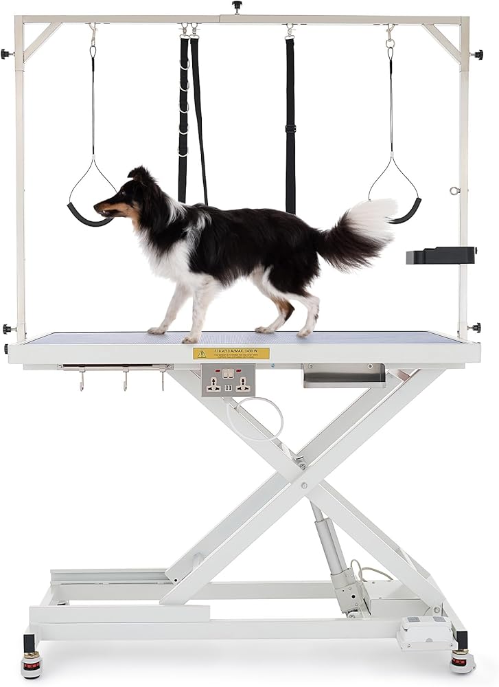 للحيوانات الأليفة الصغيرة/المتوسطة/الكبيرة: مع شريط العناية الذي يمكن تعديل ارتفاعه حتى 35.4 سم و4 أنشوط من نوعين، فإن طاولة العناية بالكلاب الكهربائية هذه تستوعب كلاب البودل والمسترد الذهبي وكل سلالات بينهما، ونعم، حتى القطط.