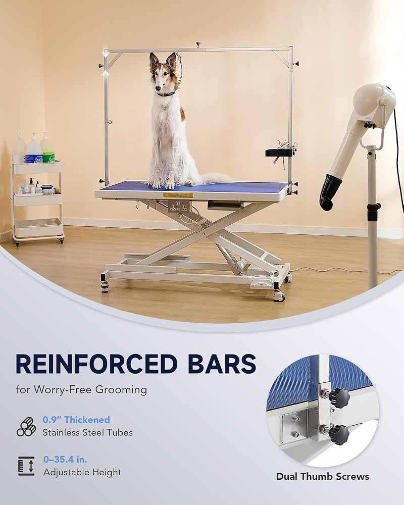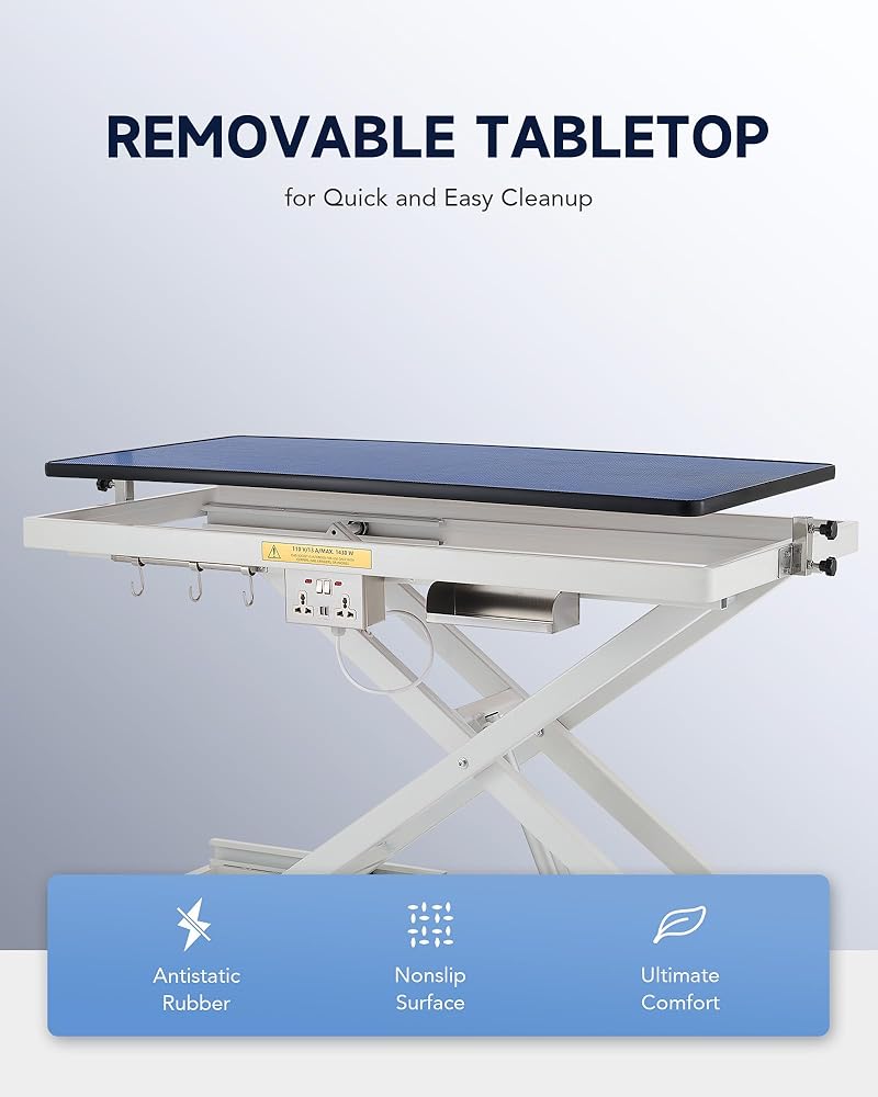 مصممة للوقوف بشكل آمن: تتميز طاولة العناية بالكلاب هذه برافعة فولاذية ثابتة على شكل حرف X، وقضيب تزيين من الفولاذ المقاوم للصدأ، وسطح طاولة مطاطي قابل للإزالة لاستيعاب ما يصل إلى 240 رطلاً. عزز كفاءتك من خلال استخدام المقابس المدمجة للوصول السريع إلى مجففات الشعر أو المكانس الكهربائية.