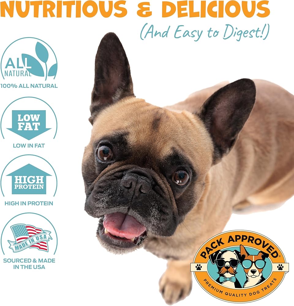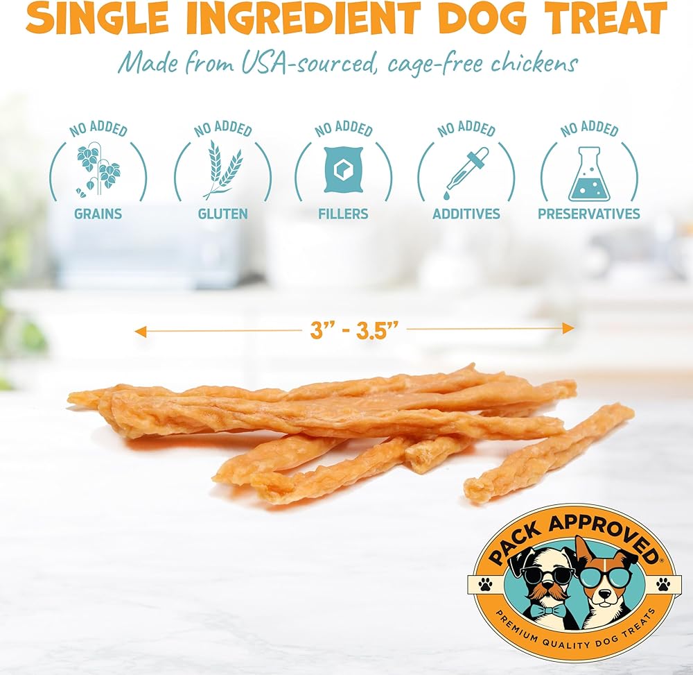Pack Approved Mini Chicken Sticks are the perfect single ingredient dog treats, made from only 100% natural chicken breast. These dog stick treats are not only high in protein they're also low fat, making them ideal for all breeds. Whether you need chicken dog treats for small dogs or dog treats for large dogs, our dog treat sticks fit the bill. These treats contain no preservatives, no additives, no gluten, and no grains- it's only dehydrated chicken dog treats! The crunchy texture of our chicken dog treats help clean teeth and reduce plaque, supporting your dog's oral hygiene. These chicken sticks for small dogs are easily digestible, suitable for puppies and adult dogs alike. The crunchy texture means they are easy to break into bite-sized pieces. Our one ingredient natural dog treats are perfect as dog snacks or training treats, offering a safe and healthy alternative to traditional chews. Enjoy peace of mind with healthy dog treats made in USA only, ensuring the highest quality for your furry friends.