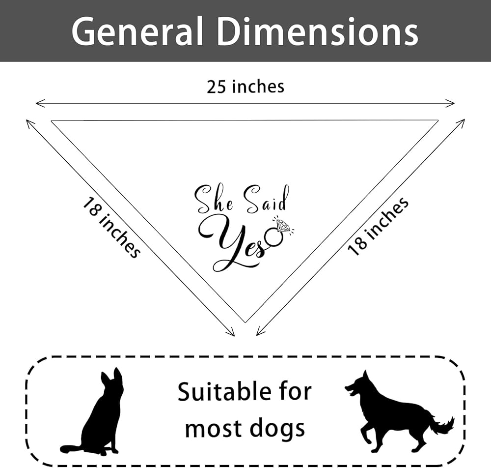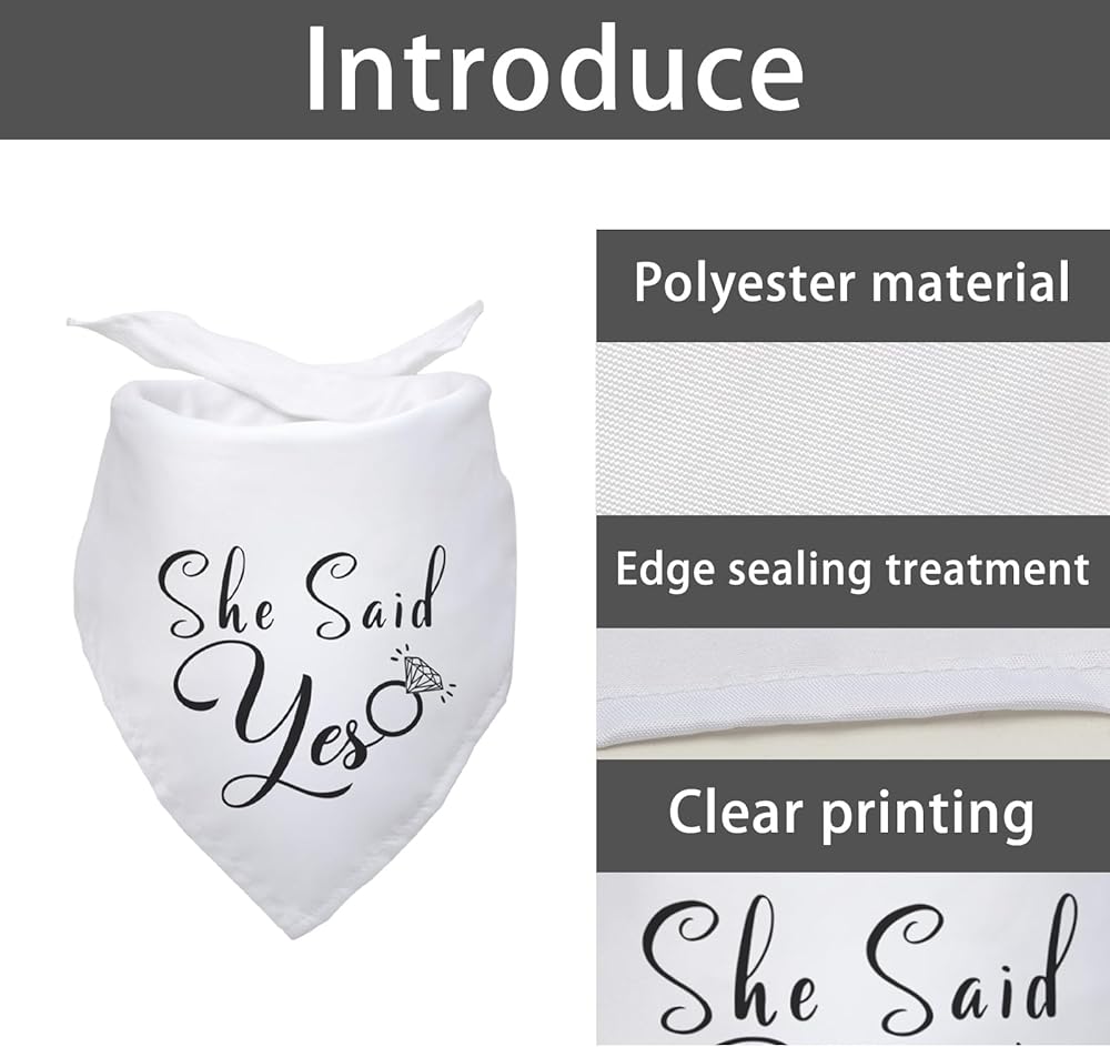 • [Engagement gifts for couples]:Cute dog bandana engraved with:she said yes, stylish font design and unique style make your pet look more cute and attractive.This is a cool engagement gift for your pet at a wedding. Also ideal as a dog bandana, breathable material to keep your dog cool on those hot summer days.