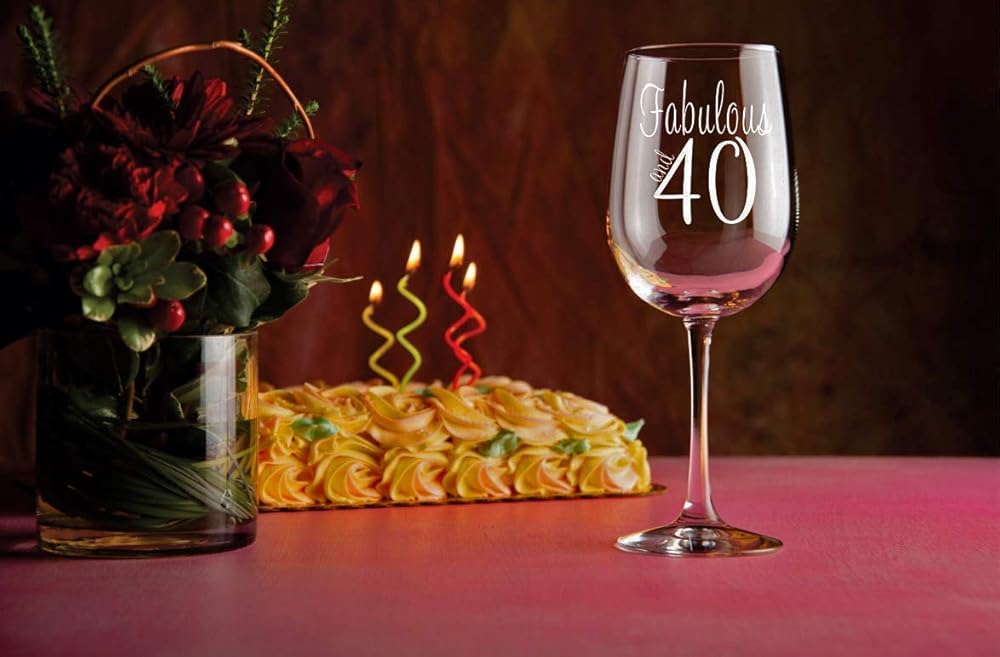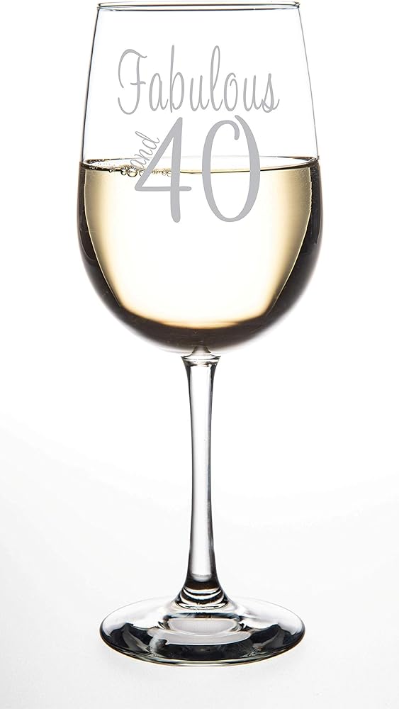 Fabulous and 40 wine glass is for that special someone turning 40 on their birthday. Show that special someone just how fabulous 40 can be. Holds a generous pour at 19 oz. This wine glass is etched with Fabulous and 40. .Permanently etched. Dishwasher safe.