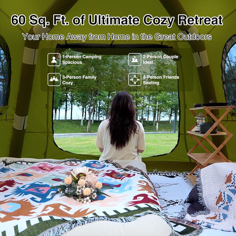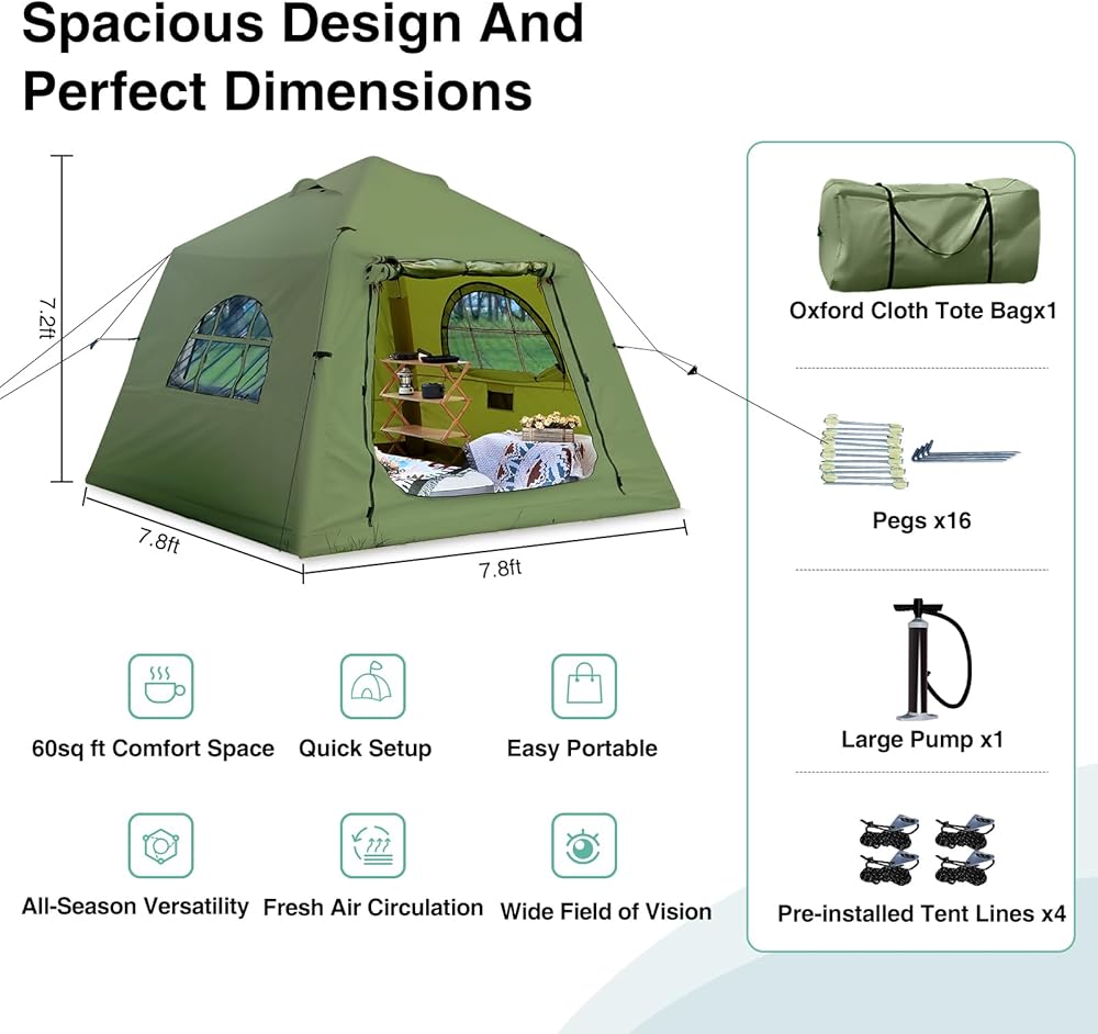 يتم إعدادها في 5 دقائق دون أي متاعب: قل وداعًا لمتاعب إعداد الخيمة التقليدية! يمكن نفخ خيمة التخييم القابلة للنفخ الخاصة بنا بسهولة في دقائق معدودة باستخدام مضخة الهواء المتضمنة، فلا داعي للقلق بشأن فقدان الأجزاء أو تلفها