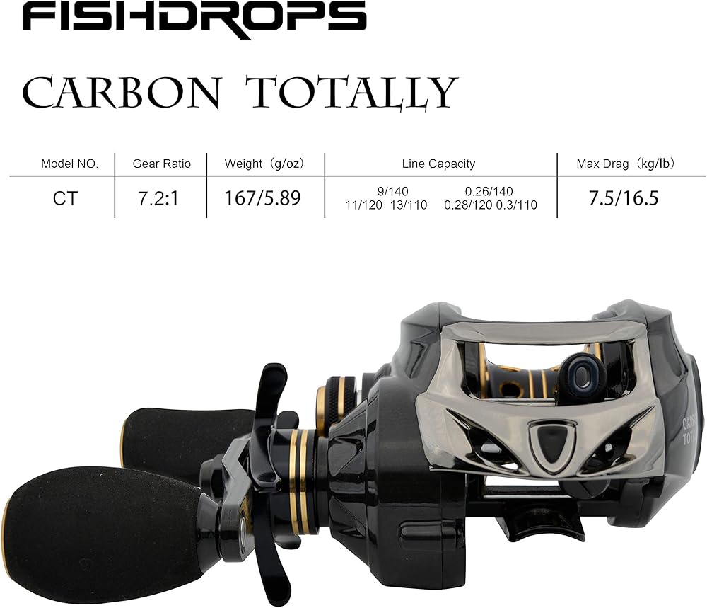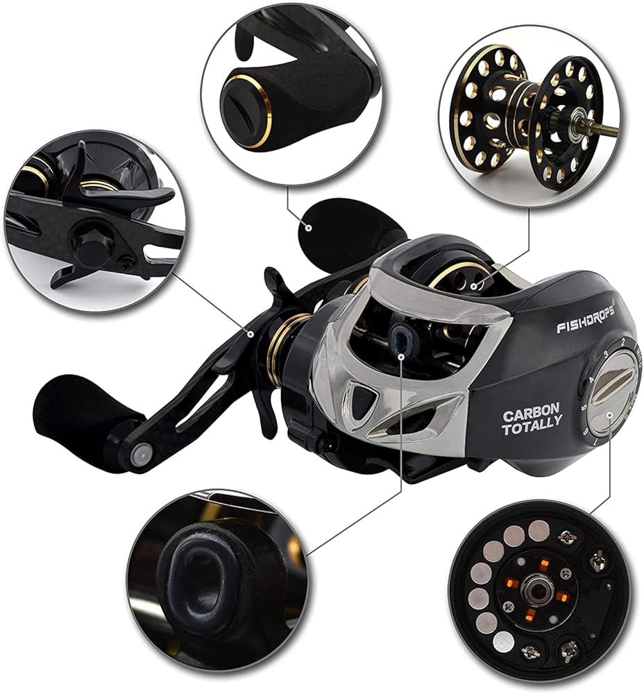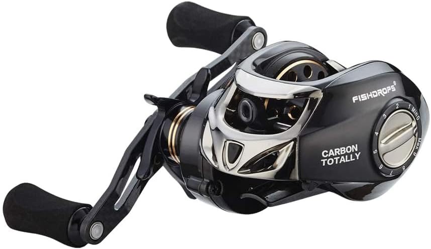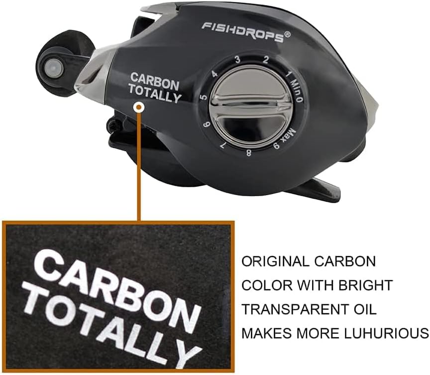 نظام الفرامل المغناطيسي - توفر بكرة Fishdrops baitcasting عملية أكثر استقرارًا وسلاسة للتحكم الكامل في الصب. نظام الفرامل المغناطيسي سحب موثوق من ألياف الكربون والذي يمكن أن يصل إلى 5.5 كجم/12.12 رطل من قوة الفرامل.