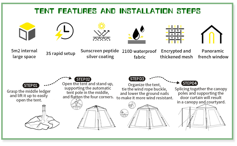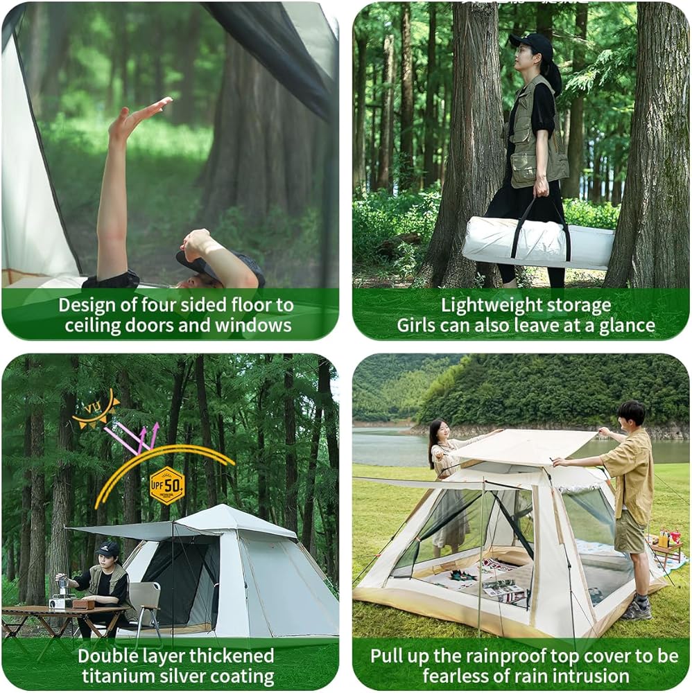 【هيكل ثابت】4 أعمدة أرجل فولاذية، وسقف مستطيل، تجعل الخيمة أكثر ثباتًا واستقرارًا ومقاومة للرياح، مثالية للتخييم في الهواء الطلق والمشي لمسافات طويلة وصيد الأسماك في جميع الأحوال الجوية. تأتي خيمة التخييم مع أكياس تخزين للحفاظ على المنتج. منظمة. استمتع بتجربة تخييم خالية من المتاعب مع خيمة التخييم المتينة والمصممة جيدًا.