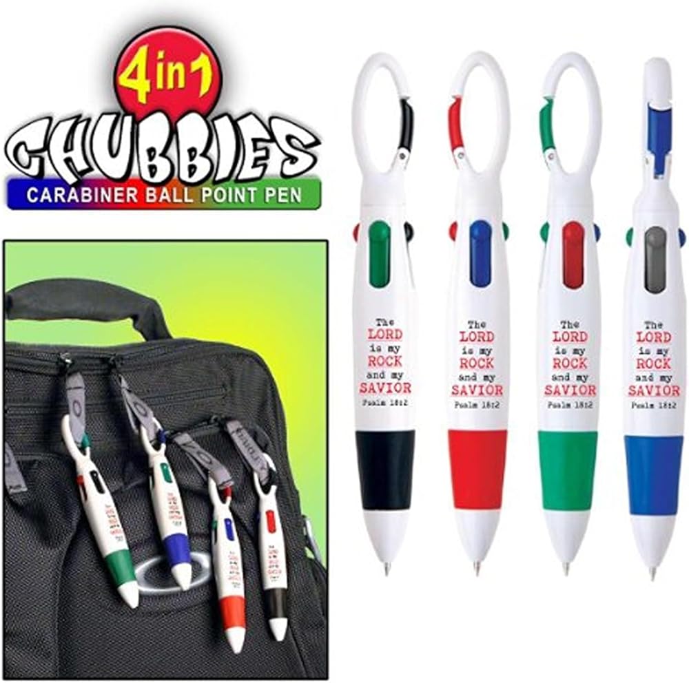 جي تي. Luscombe Carabiner Chubbies، The Lord is My Rock and Savior، آية الكتاب المقدس، ألوان متنوعة، حبر أخضر وأزرق وأحمر وأسود، 4 في 1 قابل للسحب، قلم حبر جاف، قبضة مريحة، مجموعة من 4