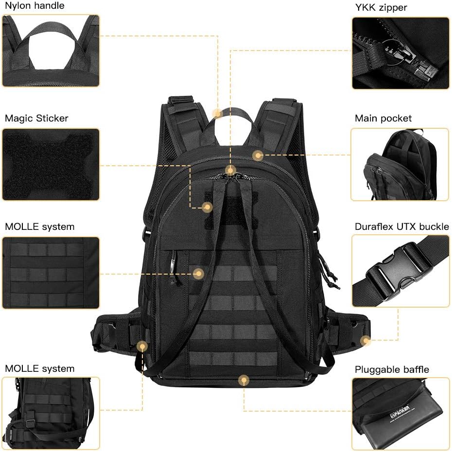 مصنوع من نايلون كوردورا 500D عالي الجودة والمتين، وسحاب YKK ومواد إبزيم UTX Duraflex، ومقابض من النايلون، وأبازيم متينة.