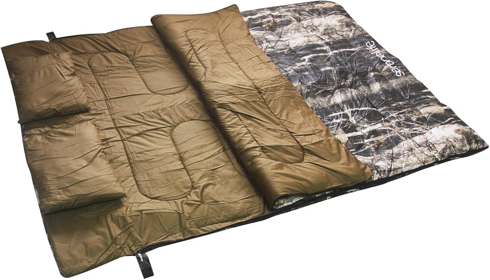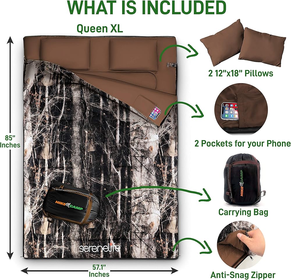 SLEEPING BAGS USED FOR TWO: -Designed to be used as one large queen size sleeping bag or as two individual sleeping bags. Imagine the memories you'll make with this. Includes two large size travel pillows
