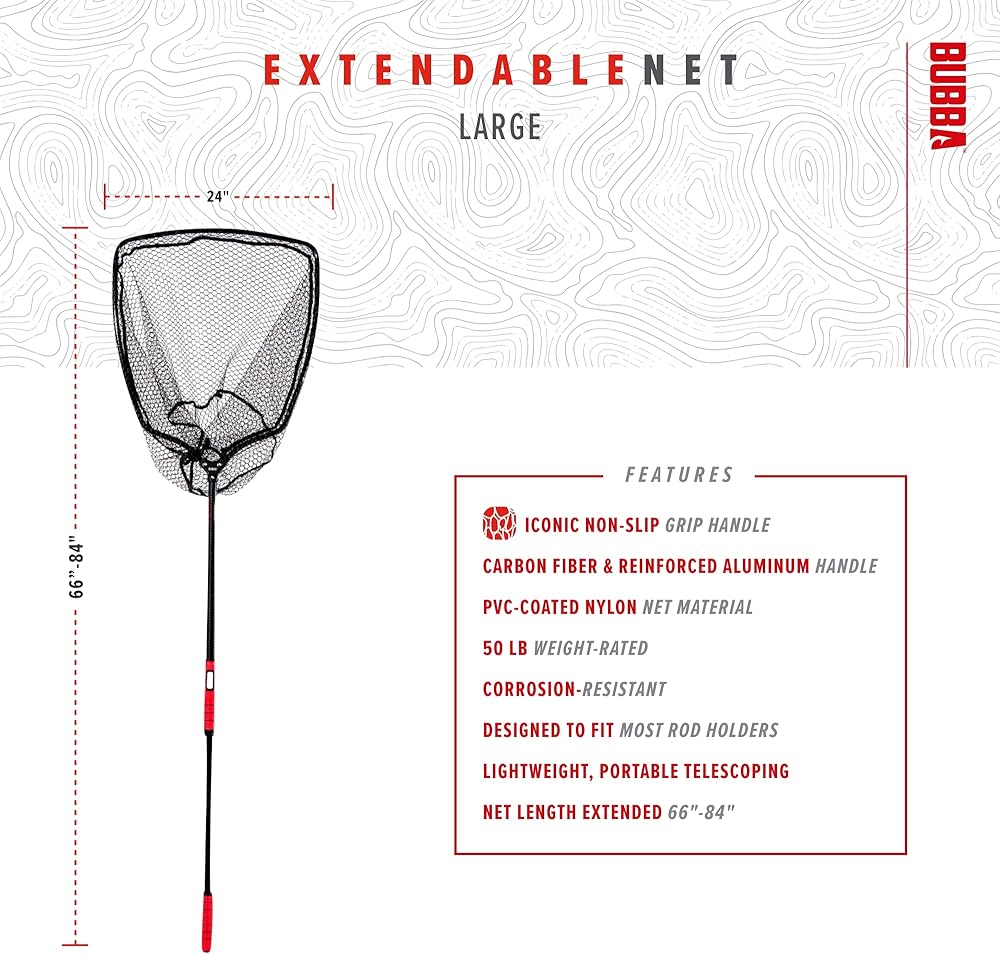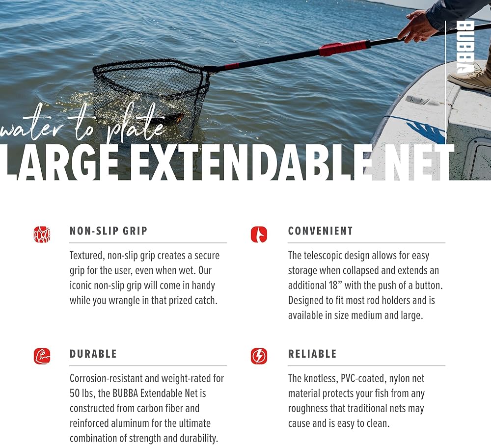 The Bubba Extendable Landing Net is the strongest and most durable extendable net on the market. Most telescoping nets that become very weak in strength when fully extended. The net is designed to withstand up to 30 pounds of weight and force at full extension. The net will extend with a click of a button. It is built to last a lifetime and hold up to any salt or freshwater environment. Available in medium and large.