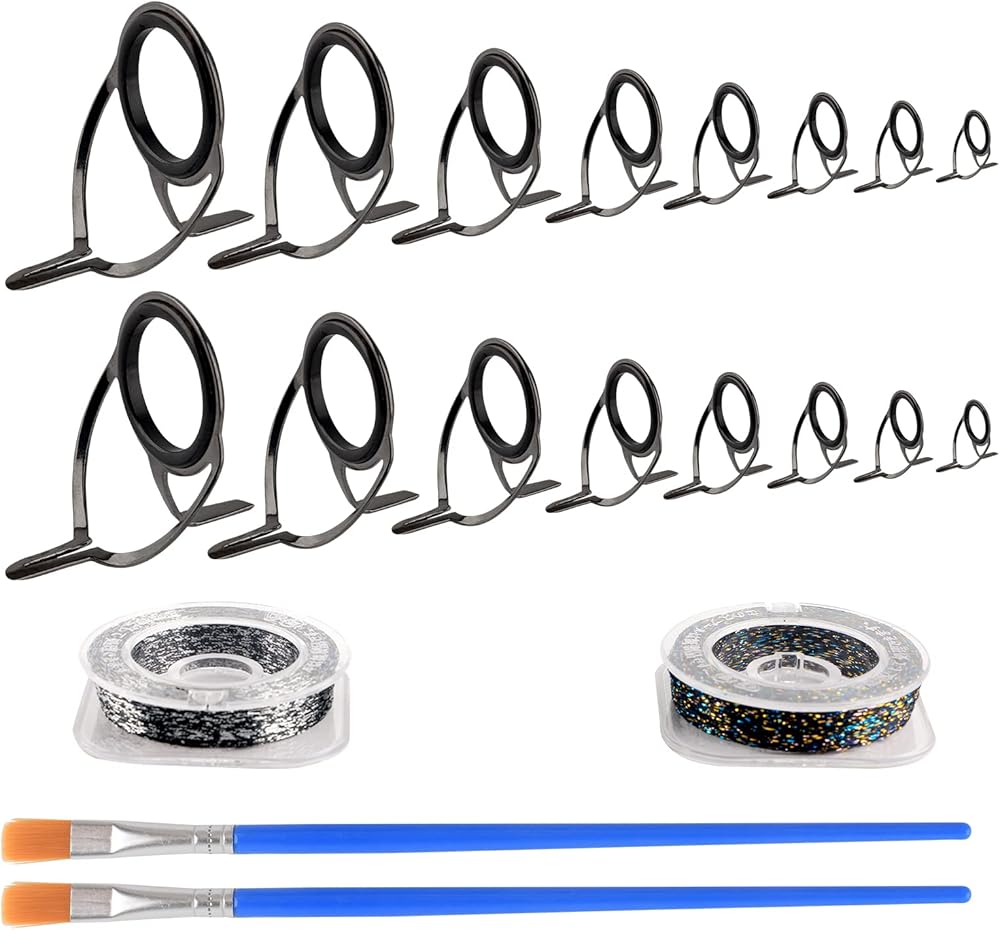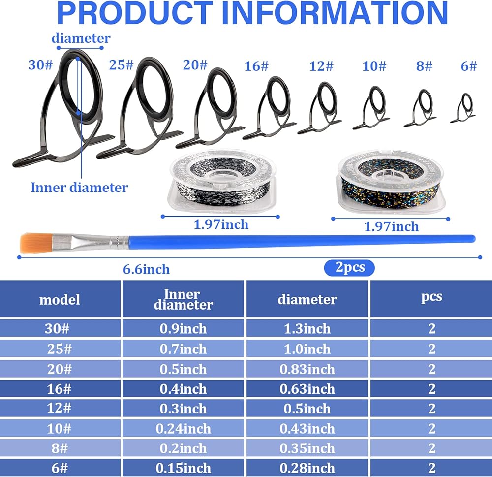 FISHING ROD REPAIR KIT - Package includes: 16pcs Double Legs Rod Guides Eyelets, 2pcs Small Paint Brush, 2pc Seal Line Wrapping Thread. The repair set includes a total of 16 rod eyelets in 8 sizes to meet your different rod repair or modification needs.