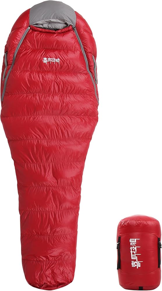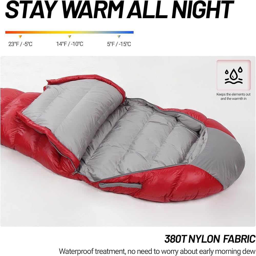 • Suitable Temperature: This Mummy sleeping bag fills with duck down and has a design temperature range of 43°F~61°F (6°C~16°C), suitable for Autumn and Winter. The backpacking sleeping bags are suitable for adults and children. As one of camping essentials, the lightweight sleeping bag can be easily taken for outdoor camping, hiking, open-air music festival or car sleeping.