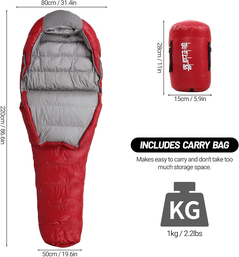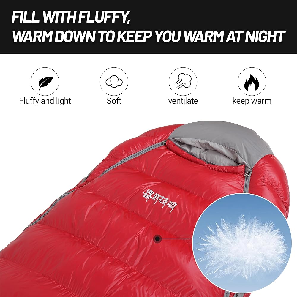 • High-quality Material: This hiking sleeping bag is designed with 3D vertical lining cabin ensuring that the down is evenly distributed. The outer layer and the lining is made of 310T Polyester, which is soft, skin-friendly and durable; The interior is filled with 200g duck down to keep warm.