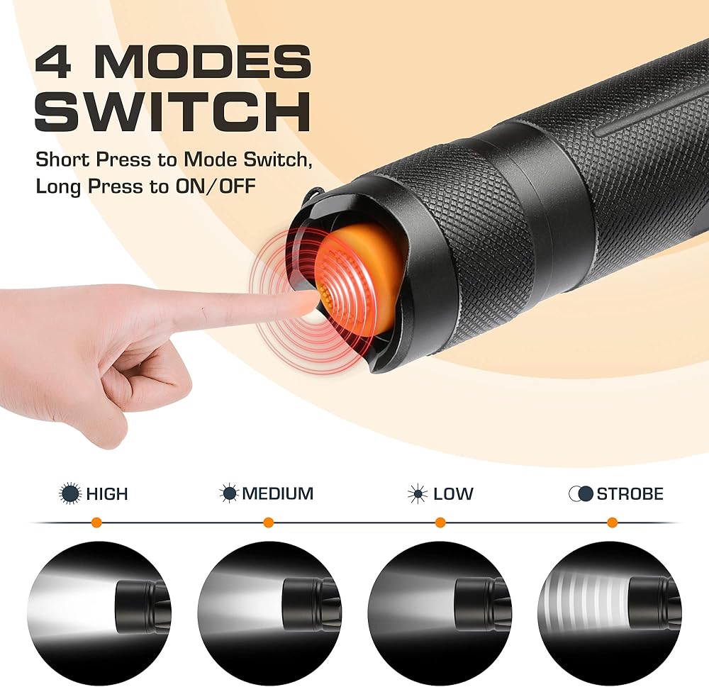4 أوضاع إضاءة: يتميز المصباح اليدوي بـ 4 أوضاع إضاءة: عالية ومتوسطة ومنخفضة وقوية، مما يسمح لك باختيار مستوى السطوع الخاص بك لأي موقف محدد. مصباح يدوي منزلي عملي للغاية مُجهز لك!