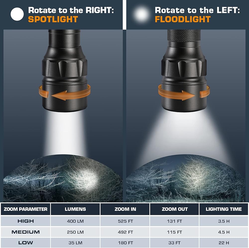 مصباح يدوي قابل للتكبير مع ضوء كشاف ومصباح كاشف: يحتوي الشعاع المركز والقوي لهذا المصباح على نطاق يصل إلى 525 قدمًا، شعاع واضح من الضوء، طويل المدى. في وضع الضوء الكاشف، تكون منطقة الإشعاع كبيرة، ويمكن رؤية مجال الرؤية على نطاق واسع، والاستخدام الخارجي للمصباح اليدوي أكثر أمانًا، ويصل النطاق أيضًا إلى 131 قدمًا.
