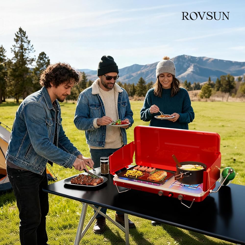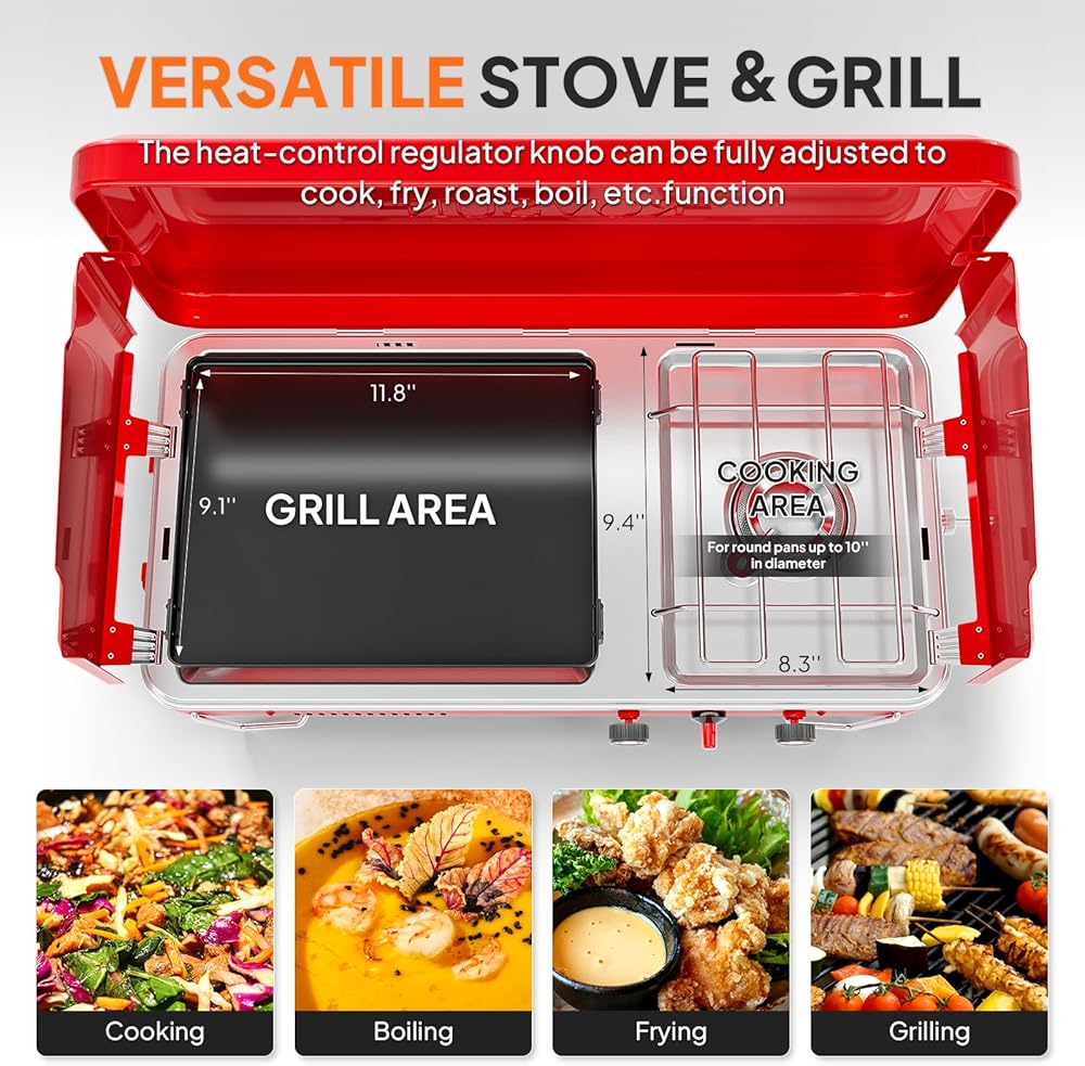 【2-IN-1 DESIGN】The combination design of the stove and griddle allows you to make delicious French toast, frying meat, grilled shrimp, grilling hot dogs, sandwiches, Mexican tortillas, etc. The high-quality griddle can quickly heat up through automatic ignition and provide precise temperature control through the knob