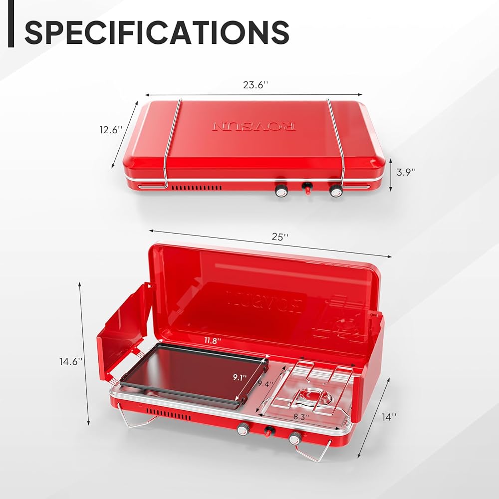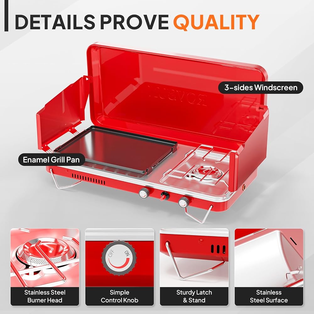 Feature: Separate grill pan and gas stove for multiple cooking methods Piezo ignition design for simple lightening up 10,000 BTU stove & 5,000 BTU grill heat quickly and evenly Wind guard to protect the flame and cooked food Dual control knobs for easy temperature control Stainless-steel countertop and metal frame for long-te