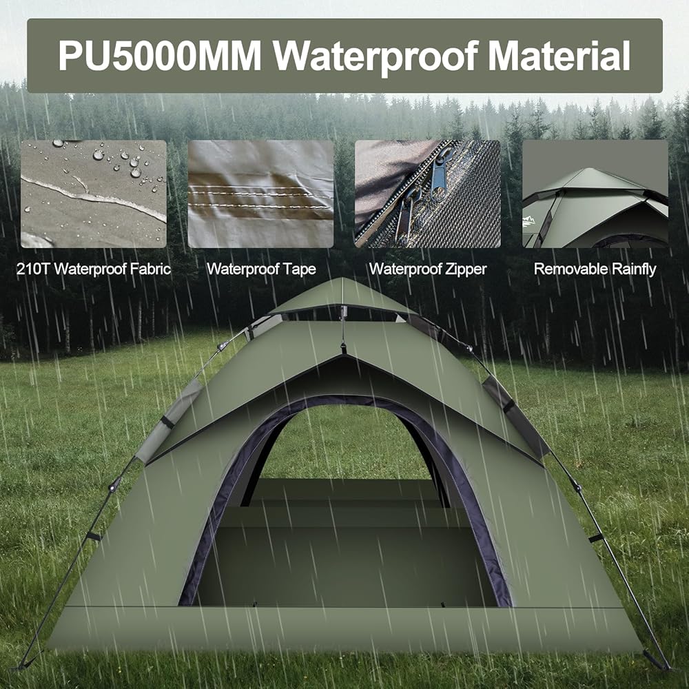 【تصميم مقاوم للماء من جميع النواحي】 يمكن لأعمدة الألياف الزجاجية القوية أن تتحمل رياح تزيد سرعتها عن 35 ميلاً في الساعة. البوليستر 210T المقاوم للهب (يضمن مقاومة الماء حتى 3000 مم)، طبقة مزدوجة مقاومة للماء، طبقات مبطنة بالكامل (تمنع التسرب)، وطبقة أرضية متينة يمكن أن تبقي الجزء الداخلي جافًا طوال الليل.