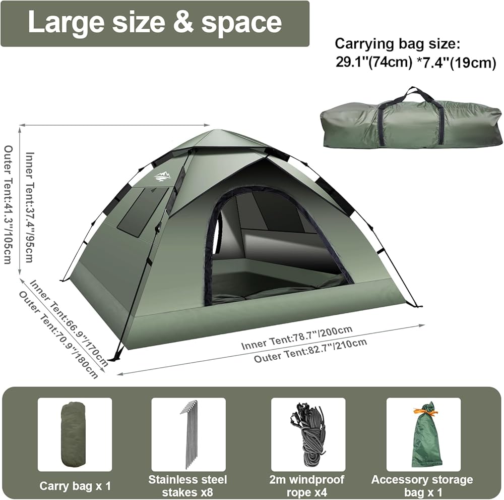 【واسعة لشخصين-3 أشخاص】83*71*41 بوصة (خارجي)؛ 79*67*37 بوصة (الطول × العرض × الارتفاع داخليًا). إنها واسعة بما يكفي لاستيعاب 3 أشخاص بالغين أو 4 أطفال. خيمة عائلية واسعة لتناسب المرتبة الهوائية ذات الحجم الكبير ومعدات التخييم. الأكبر، كلما كان ذلك أفضل. حجم العبوة هو 29.8 * 6.1 * 6.1 بوصة فقط (الطول × العرض × الارتفاع)، مما يجعلها مريحة للغاية للحمل وتسمح لك بالاستمتاع برحلة مريحة وممتعة.