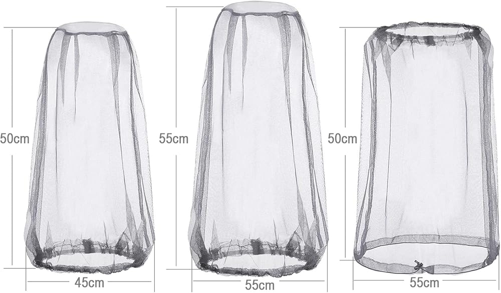 Mosquito Head Net Mesh Gnat Head Face Netting Pack of 3 comes with 1 x Big Mosquito Head Net Mesh for Adults(55X55cm), 1 x Small Mesh Face Netting for Children(50X45cm), 1 x Mosquito Net for Hat(50X55cm). This mosquito head netting is used for your face and neck while you are outdoors especially useful for the summer seasons.