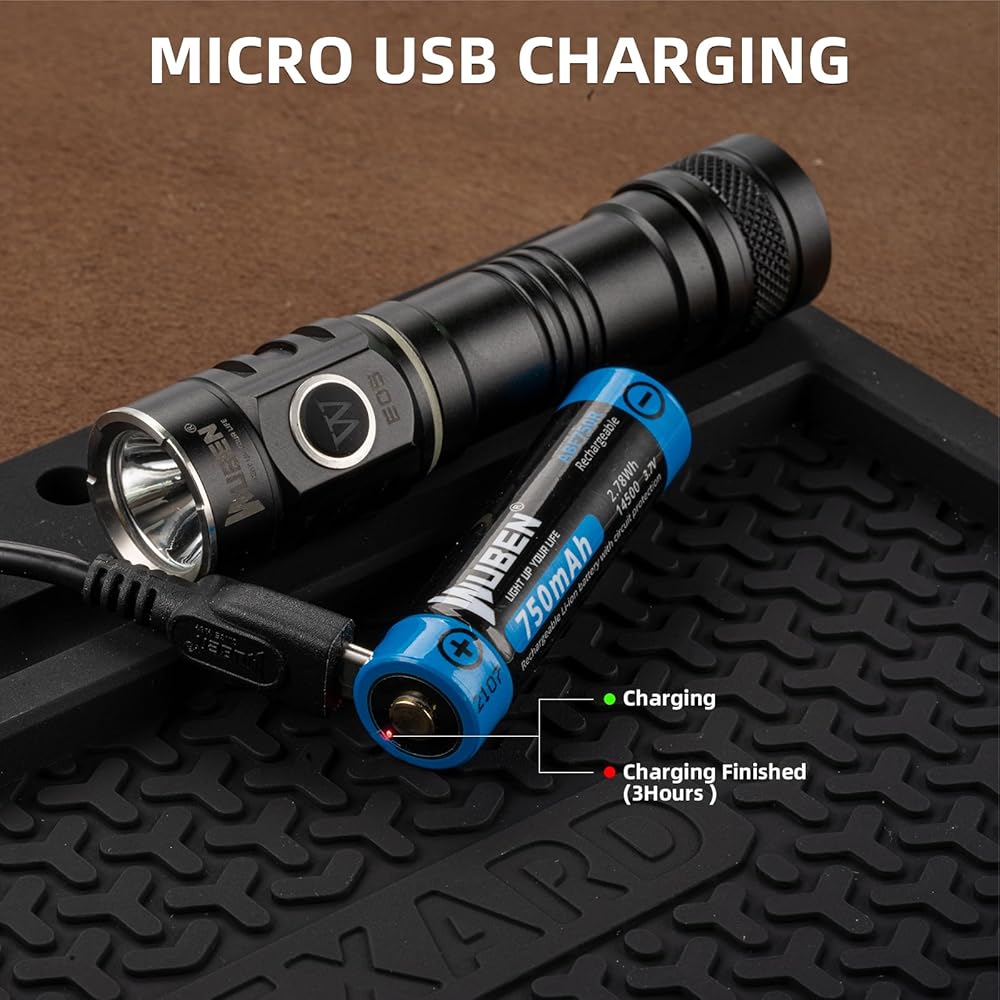 قابلة لإعادة الشحن: يتضمن مصباح WUBEN المحمول بطارية قابلة لإعادة الشحن عالية السعة 750 مللي أمبير توفر 900 لومن من ساعات ثابتة أو تتحول إلى وضع منخفض 1 لومين لمدة تصل إلى 115 ساعة من الضوء. مع منفذ شحن USB مدمج للبطارية وكابل USB 5 فولت 1 أمبير، يمكنك شحن البطارية عند الحاجة