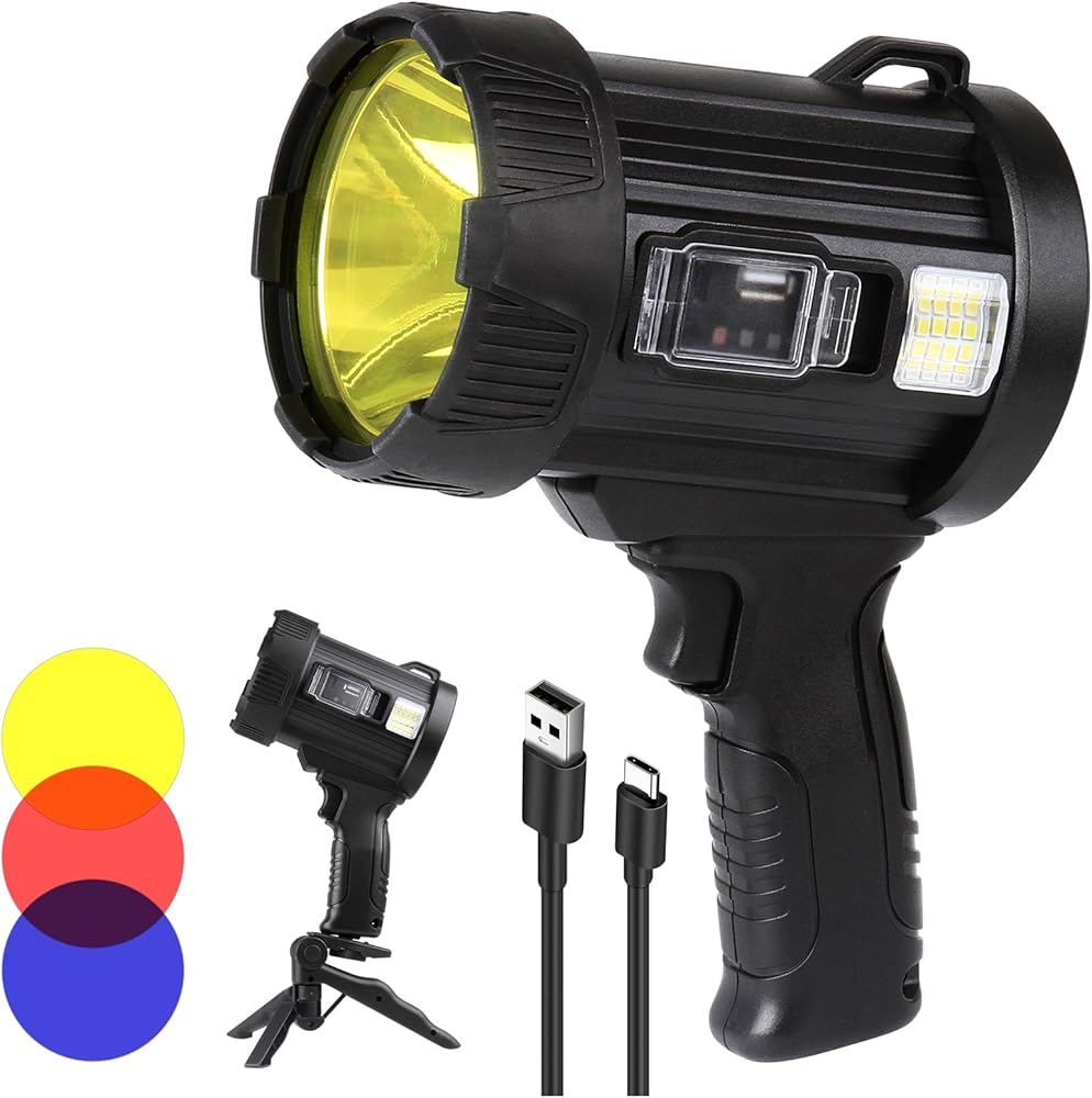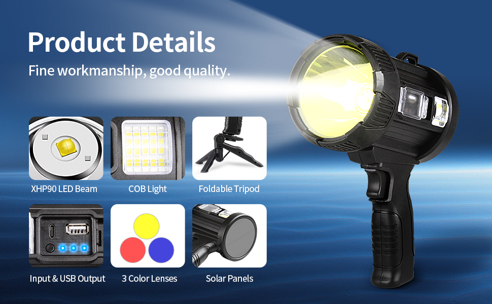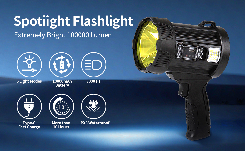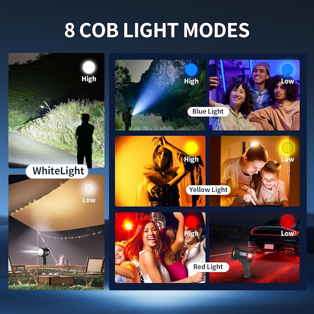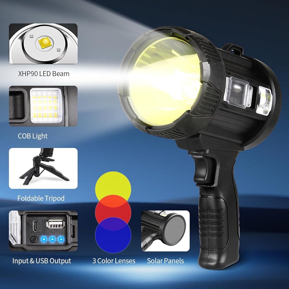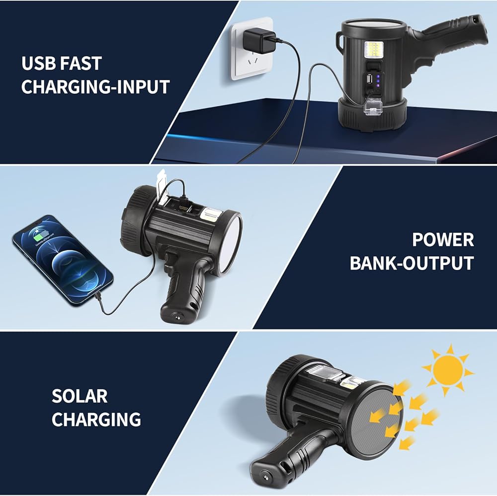 🍊🍊【مصباح كشاف فائق السطوع 1000000 لومن】يستخدم مصباح الكشاف القابل لإعادة الشحن الخاص بنا شريحة XHP90 لإنتاج سطوع إضاءة يتجاوز ثلاثة أضعاف مستوى سطوع المصابيح الكاشفة العادية أو الأضواء الكاشفة. يتمتع بمخرج قوي يصل إلى 1000,000 لومن لنطاق عرض واسع!