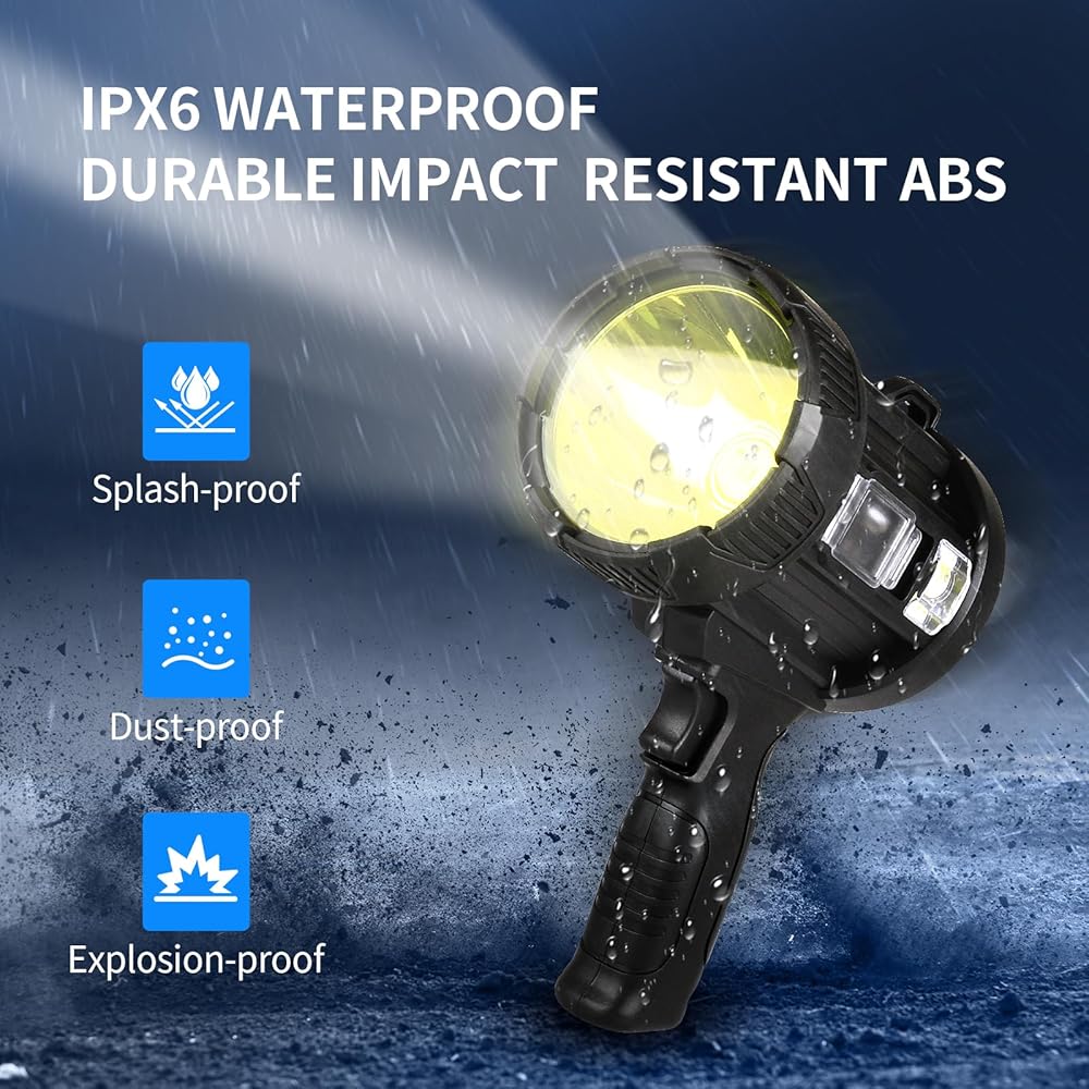 🍊🍊[IPX6 قوي ومقاوم للماء] مصباح الكشاف عالي الطاقة القابل لإعادة الشحن مصنوع من مادة ABS عالية القوة وسبائك الألومنيوم، وهي صلبة ومقاومة للصدمات، مما يضمن أقصى قدر من المتانة. يتحمل السقوط من ارتفاع يصل إلى 3 أمتار. هذا المصباح عالي الطاقة مقاوم للماء بدرجة IPX6، لذا يمكنك استخدامه في الأيام الممطرة. وفي الوقت نفسه، يجب عليك دائمًا إغلاق صمام منفذ الشحن لمنع تساقط مياه الأمطار في منفذ الشحن!
