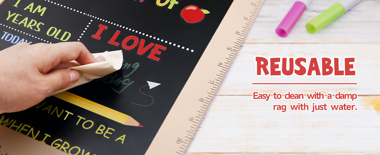 • يعمل مع الطباشير العادي ومعظم أقلام الطباشير، ويسهل تنظيفه بقطعة قماش مبللة بالماء فقط.