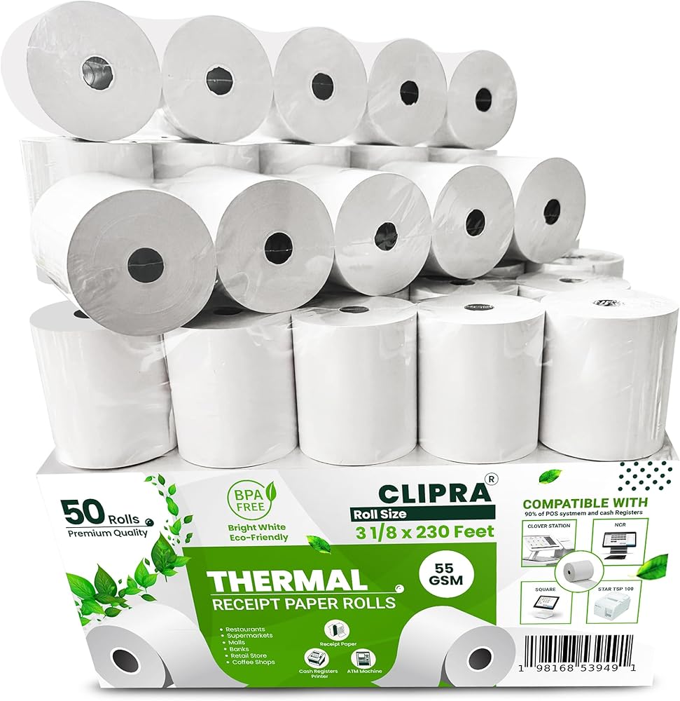 تغليف متين وآمن: يتم تغليف اللفات الخاصة بنا بالبلاستيك للحماية من الغبار والرطوبة، وجميع اللفات معبأة في صندوق قوي من 5 طبقات من أجل التسليم الآمن. تبلغ أبعاد كل لفة 80 مم × 71 مم، مما يضمن ملاءمتها تمامًا لنقاط البيع أو ماكينة تسجيل النقد الخاصة بك. مصنوعة من ورق جديد للحصول على جودة متسقة.