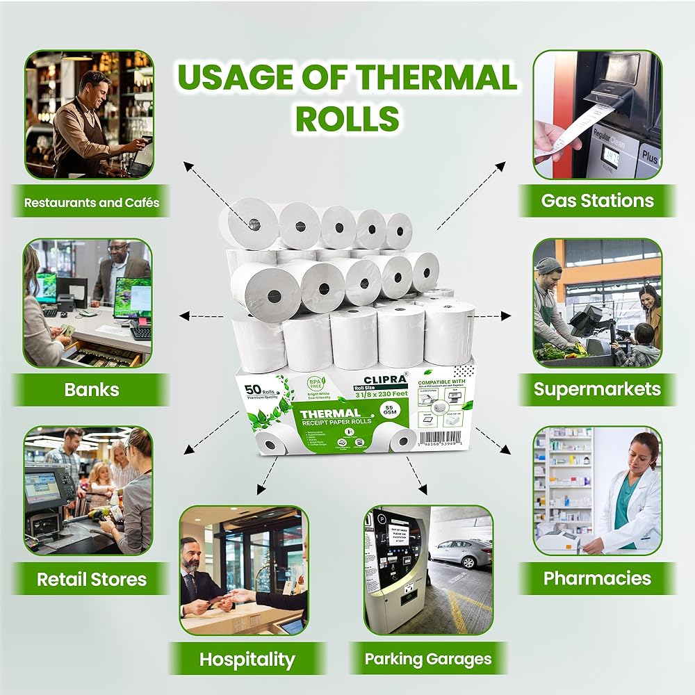 خالية من مادة BPA: الورق الحراري الخاص بنا خالٍ من مادة BPA، مما يجعلها أكثر أمانًا لك ولعملائك والبيئة. اختر خيارًا صحيًا دون المساس بالأداء، واستمتع براحة البال التي تأتي مع المنتجات عالية الجودة.