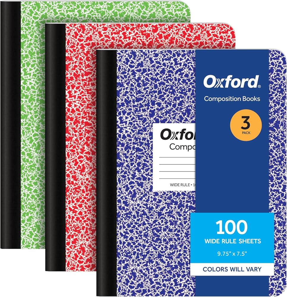 Oxford composition notebook multipacks now come in a convenient 3 pack perfect for school supplies, office supplies and everyday use. These wide-ruled notebooks provide roomy lines for large handwriting; the perfect notebooks for creative writing, journaling, note taking or science lab work. Also makes a great homeschool or preschool tool for beginning writers. Center-sewn notebook pages make the composition notebook a teacher favorite. Creates a tamper-evident, permanently bound journal, science notebook, bullet journal or writing notebook. Paper handles ink pens, colored pencils and highlighters for beautiful notes. Classic marble covers now in bright primary colors with space inside for name and class up front, and weight and measurement conversion charts in back. Composition notebooks are an affordable addition to the home office, traditional, or homeschool supplies lists; ideal for journalers, writers, artists, scientists and note takers of all stripes. Wide ruled paper. 9-3/4" x 7-1/2". 100 Sheets/200 Pages. 3 Pack with green, blue, and red marble covers.