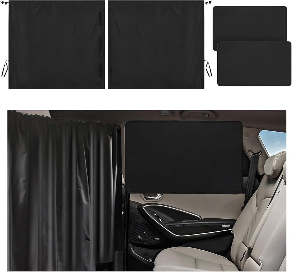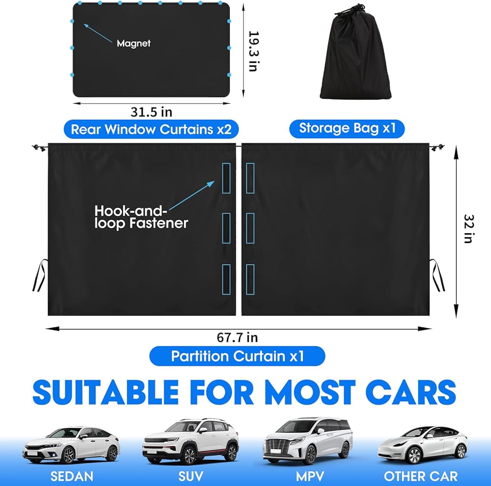 【ستائر خصوصية السيارة العالمية】: قم بتحويل المقعد الخلفي لسيارتك إلى مساحة خاصة مع مجموعتنا الشاملة. تتضمن قطعة واحدة من ستائر تقسيم المقعد الخلفي الطويلة (67.7 بوصة × 32 بوصة)، وقطعتين من ستائر النافذة الجانبية الخلفية بالشفط المغناطيسي (31.5 بوصة × 19.3 بوصة)، وحقيبة تخزين مريحة. مصممة لتناسب معظم سيارات السيدان وسيارات الدفع الرباعي والشاحنات الصغيرة والشاحنات والسيارات متعددة الأغراض وما إلى ذلك. (يرجى التحقق من الأبعاد قبل الشراء.)