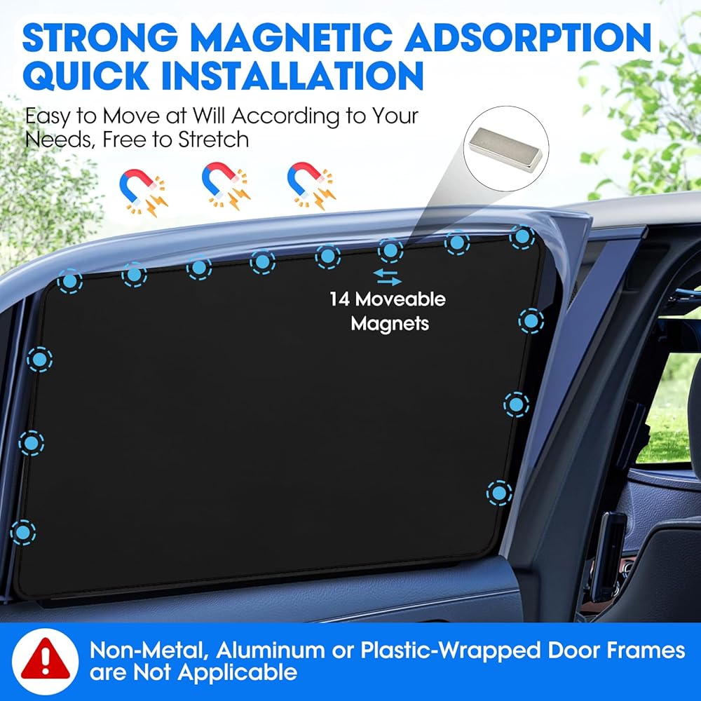 【ستائر جانبية مغناطيسية قوية】: تتميز كل ستارة جانبية بـ 14 مغناطيسًا متحركًا. ما عليك سوى وضعه على إطار النافذة الجانبية الفولاذية وضبطه على الموضع المطلوب. ملحوظة: تجنب استخدام ألياف الكربون أو الأسطح المصنوعة من الألومنيوم. توفر مظلات الشمس لدينا ملاءمة عالمية، ولكن التغطية قد تختلف باختلاف موديلات السيارات. اختبر مغناطيسية إطار النافذة وقم بقياس حجم النافذة قبل الطلب لضمان الملاءمة والتغطية المناسبة.