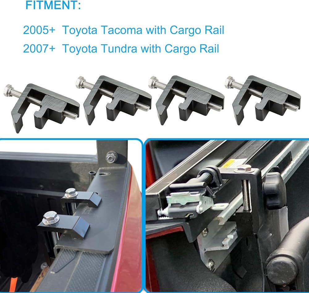 الإعداد: مشابك تثبيت نظام المسار هذه مناسبة لسيارة Toyota 2005+ Tacoma Cargo مع نظام السكك الحديدية، 2007+ Tundra Cargo مع نظام السكك الحديدية.