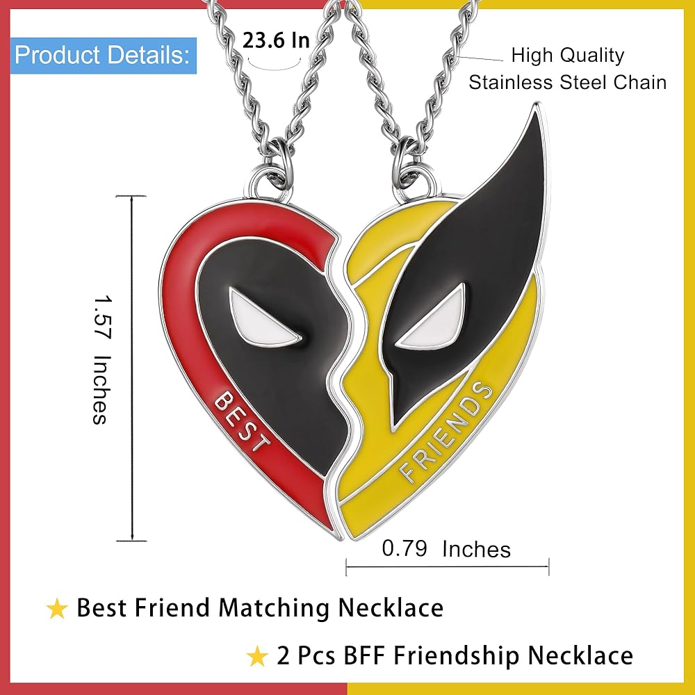 • قلادة BFF المتطابقة: قلادة مستوحاة من الصداقة/الأزواج مستوحاة من Dead-Hero&Wolf. قد تتغير مساراتنا مع استمرار الحياة، لكن الرابطة بيننا تظل قوية إلى الأبد. القلادة المثالية للمسافات الطويلة التي تجعل الأشخاص المتباعدين يشعرون بالارتباط، كما لو أنهم لم يكونوا منفصلين أبدًا.