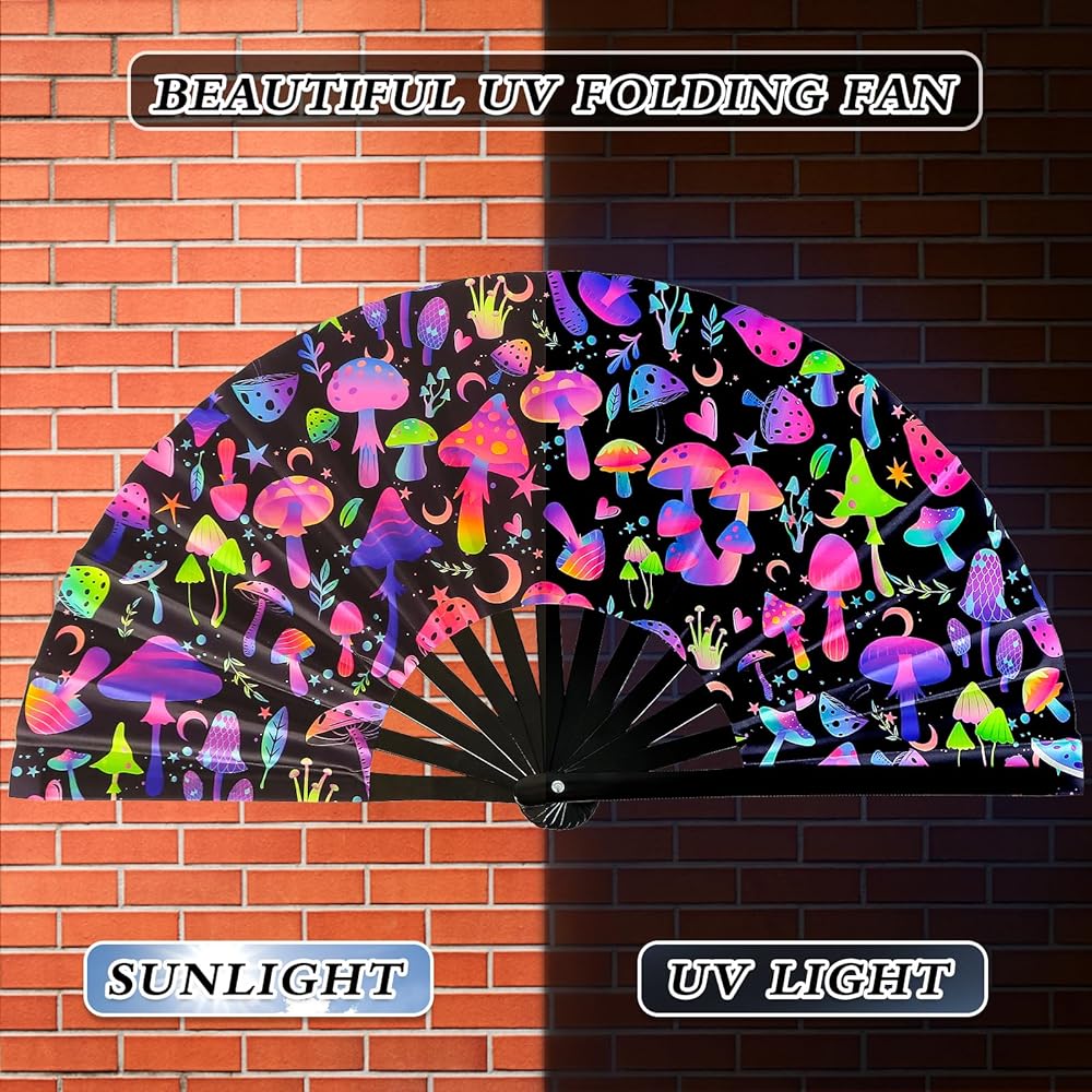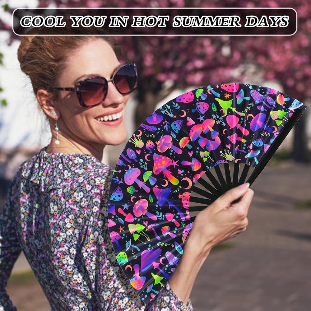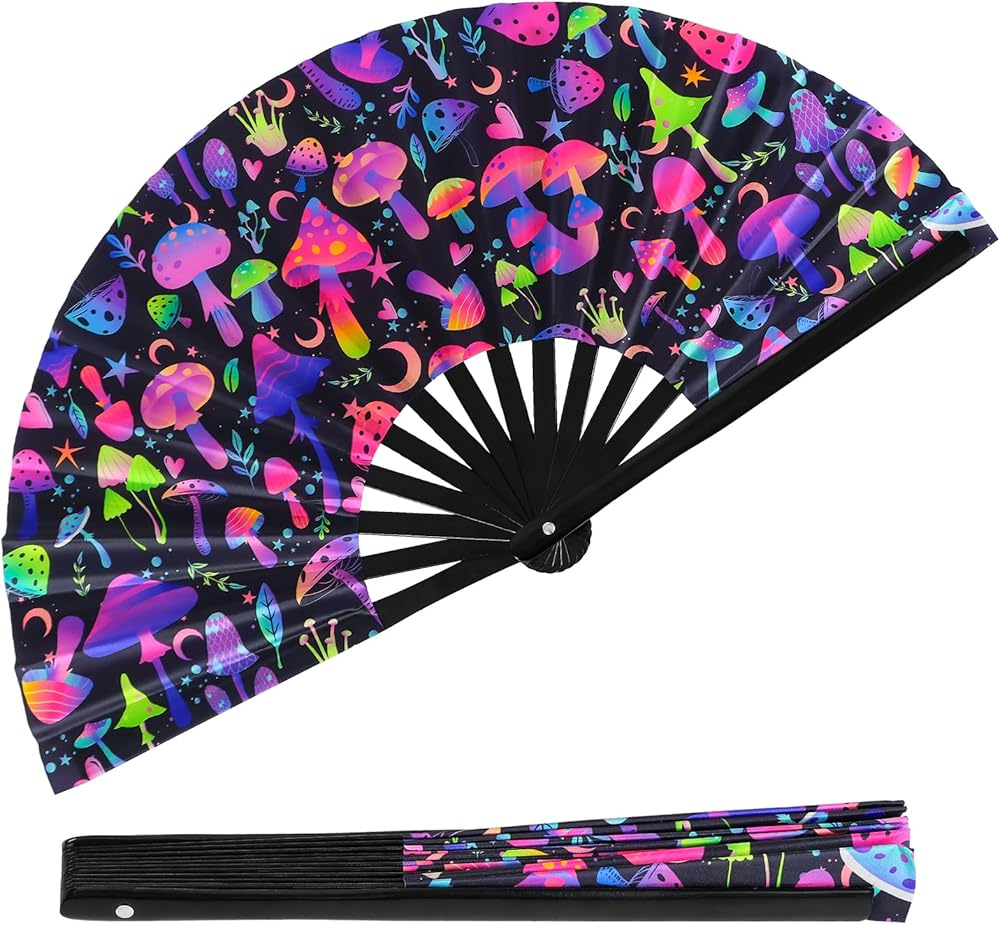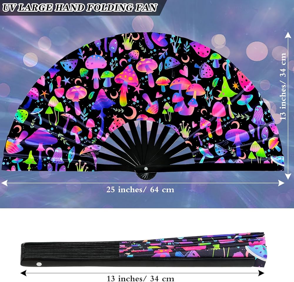 Eye-catching design: featuring a classical glitter design and fluorescent ink printing, makes the folding fan have a wonderful glow under the UV lights or party blacklight. Our large hand fan is sure to catch performances' eyes and turn heads wherever you take it, and never fade. It also helps you survive the heat at a rave or festival like EDC, UMF!
