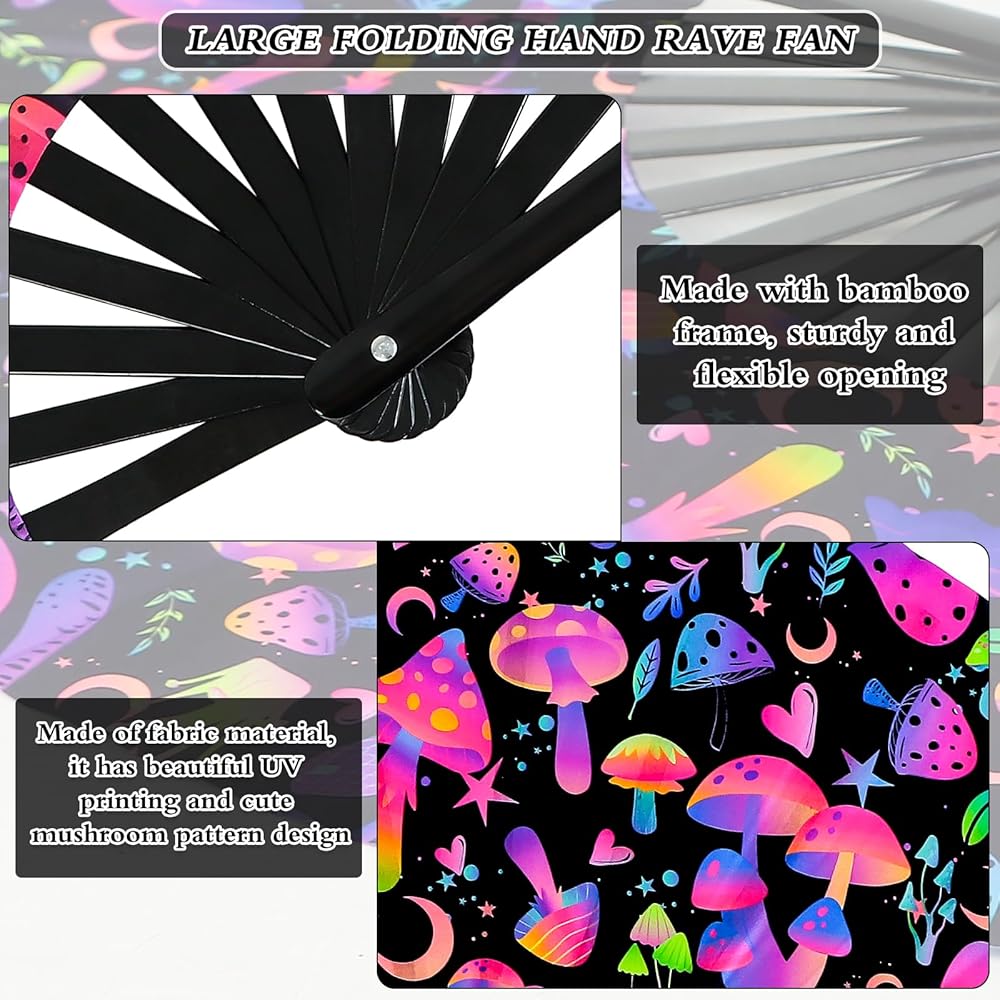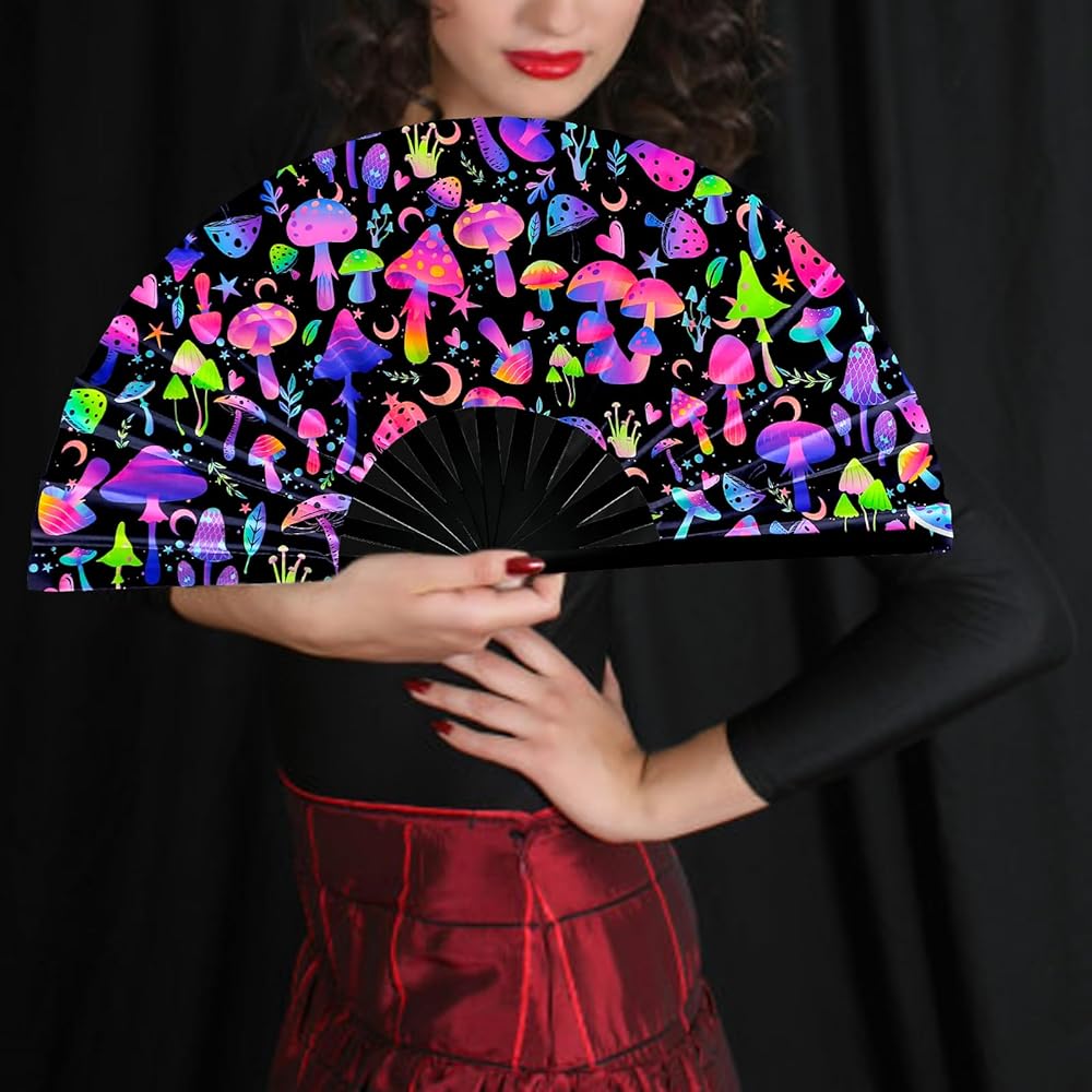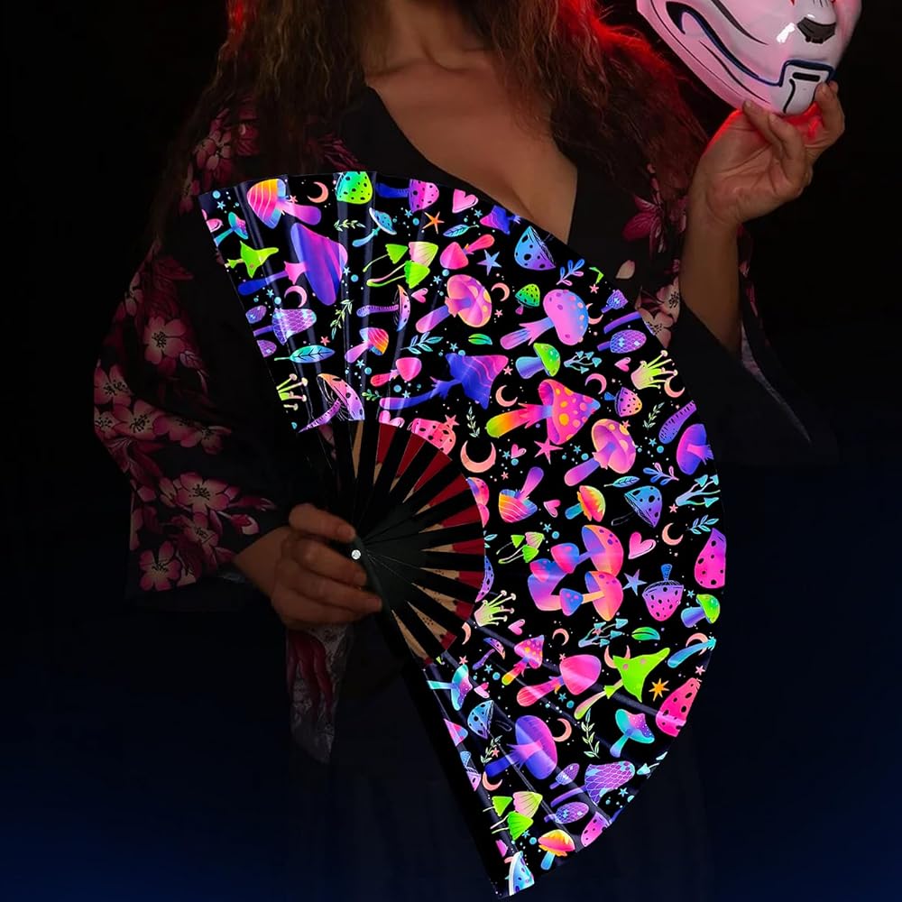 Eye-catching design: featuring a classical glitter design and fluorescent ink printing, makes the folding fan have a wonderful glow under the UV lights or party blacklight. Our large hand fan is sure to catch performances' eyes and turn heads wherever you take it, and never fade. It also helps you survive the heat at a rave or festival like EDC, UMF!