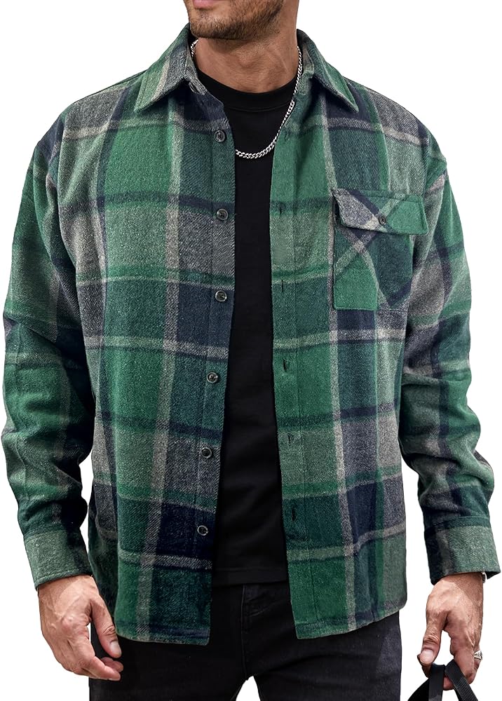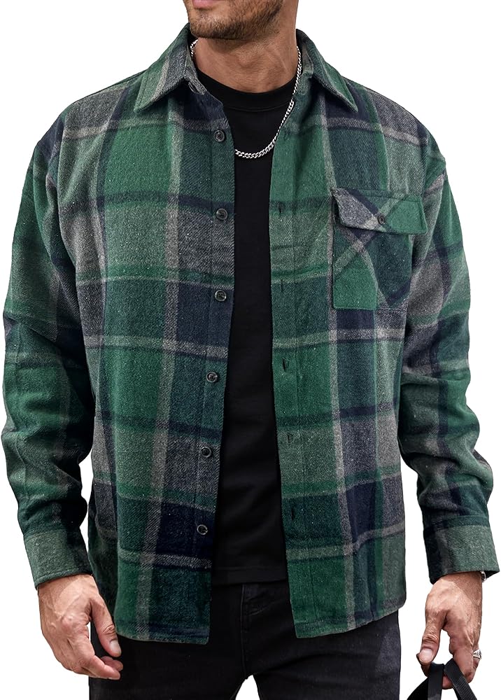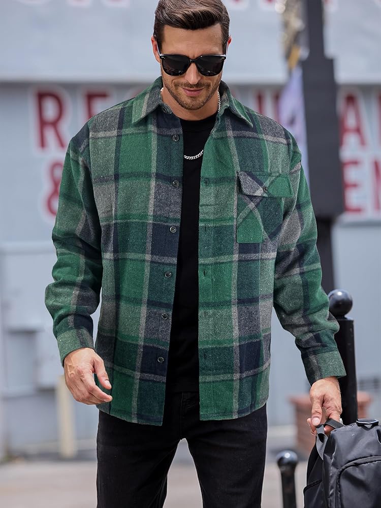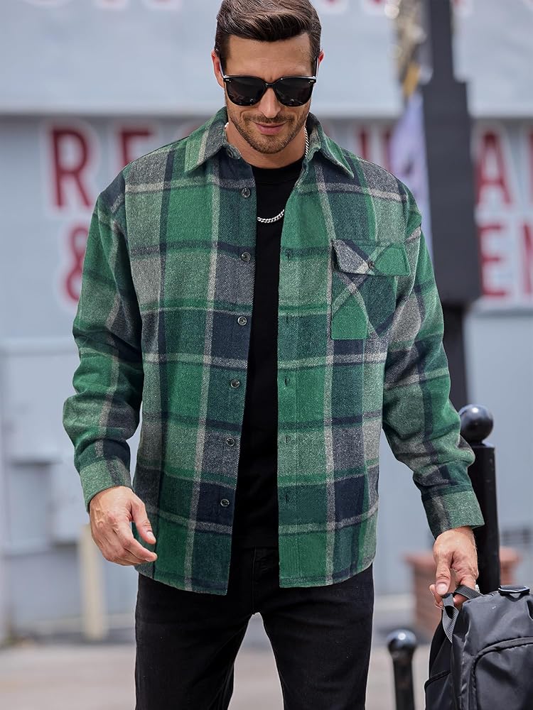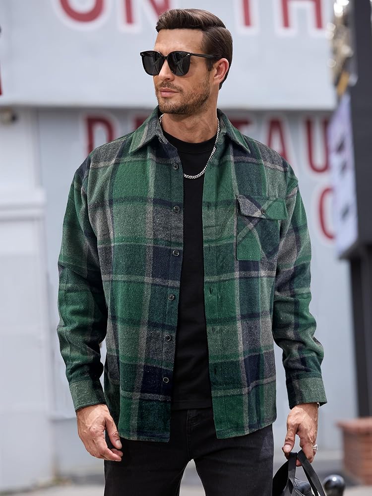 تصميم فريد وعملي: يتميز بتصميم فريد من نوعه منقوش من الفلانيل، هذا الجاكيت الرجالي يضفي لمسة من الأناقة على خزانة ملابسك في الخريف والشتاء. تحتوي على جيب واحد على الصدر، مما يوفر سهولة الوصول إلى ضرورياتك. هذا التصميم لا يعزز أسلوبك فحسب، بل يضيف أيضًا وظائف إلى ملابسك.